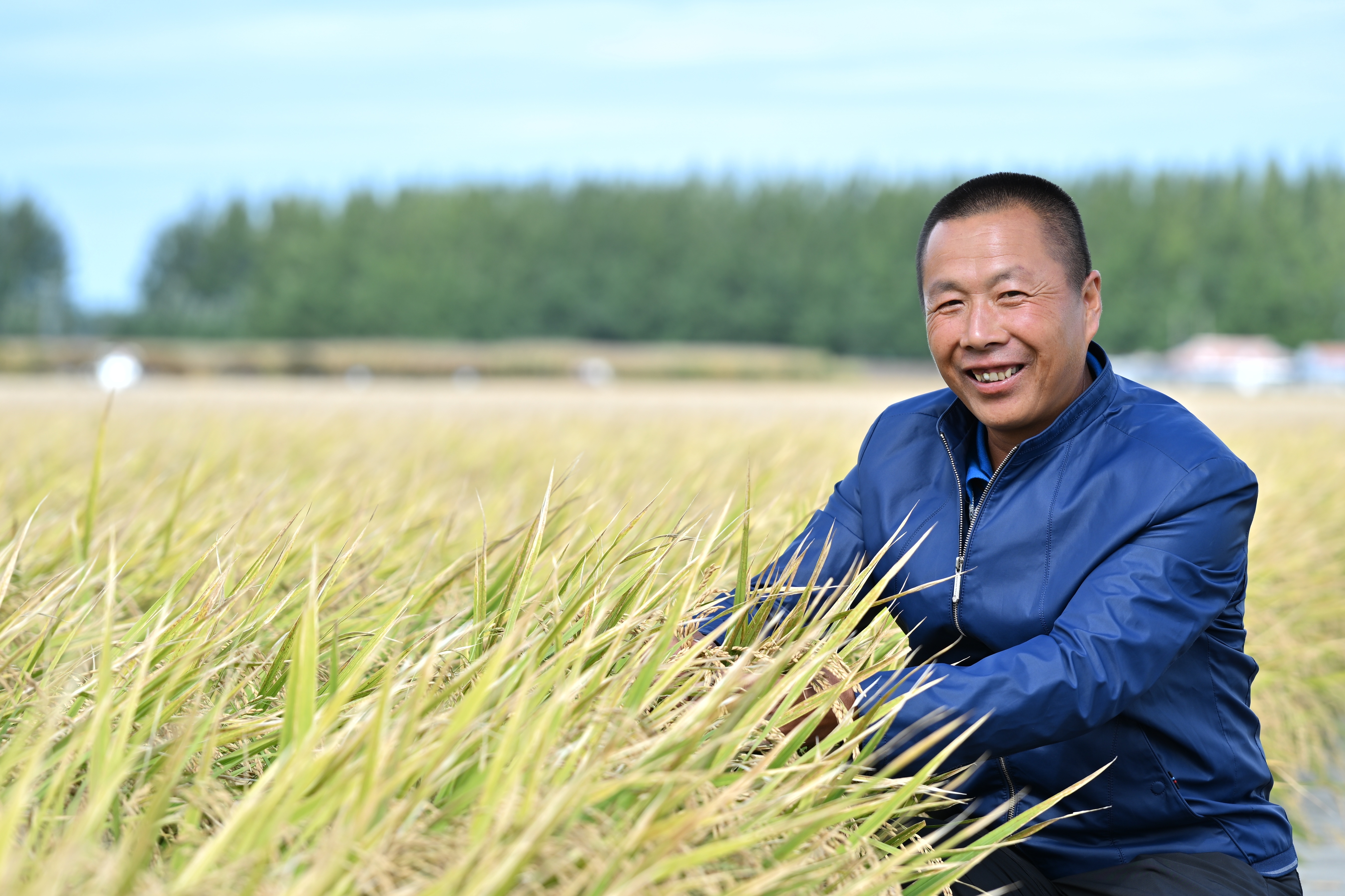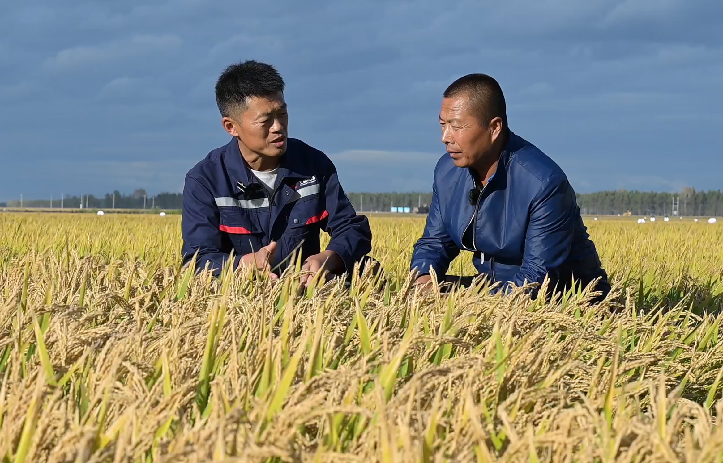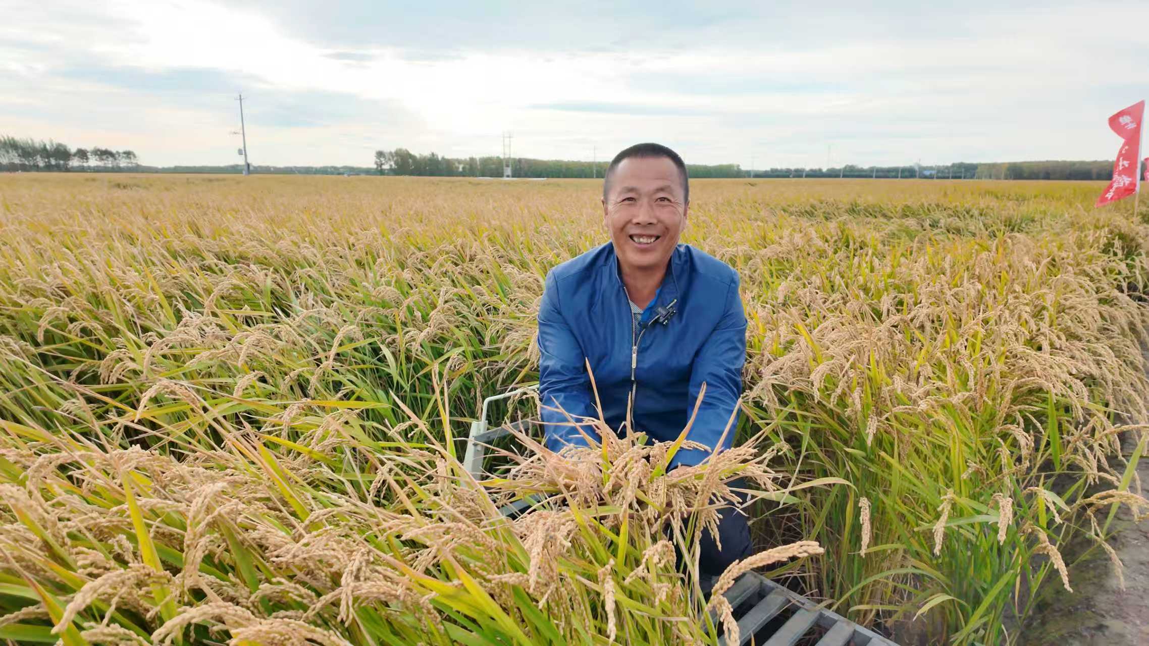 蹲在晾晒的水稻旁边,他抓起一把稻粒递给记者看,告诉记者今年高产的原因,“年景是好!积温够,水稻的生长期非常长。但也不都是老天的功劳,这里头也有科技含量。”