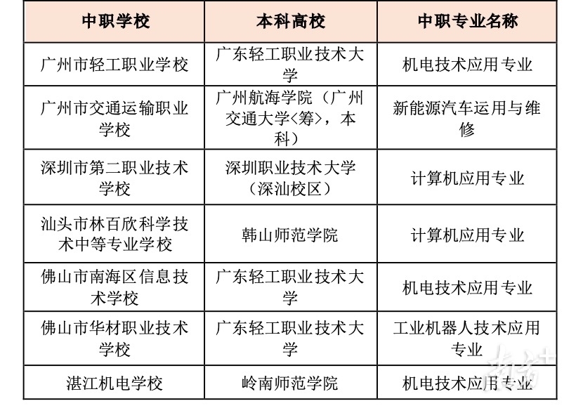 根据不完全统计,目前广东已有不少于7家中职学校发布了试点计划。对接本科院校包含广东轻工职业技术大学、深圳职业技术大学、广州航海学院、韩山师范学院、岭南师范学院等,其中包括前两年升本的2所职业技术大学。