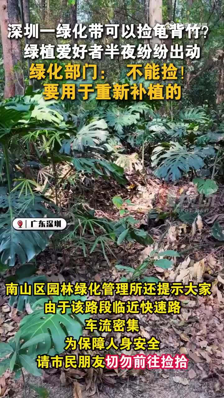 近日,社交平台热传“深圳某绿化带龟背竹清理可采摘”消息,引发市民纷纷前往。南山区城市管理和综合执法局工作人员回应称:“实为绿化整治补植用苗,因工人好心赠予路人引发误解。”详情>>