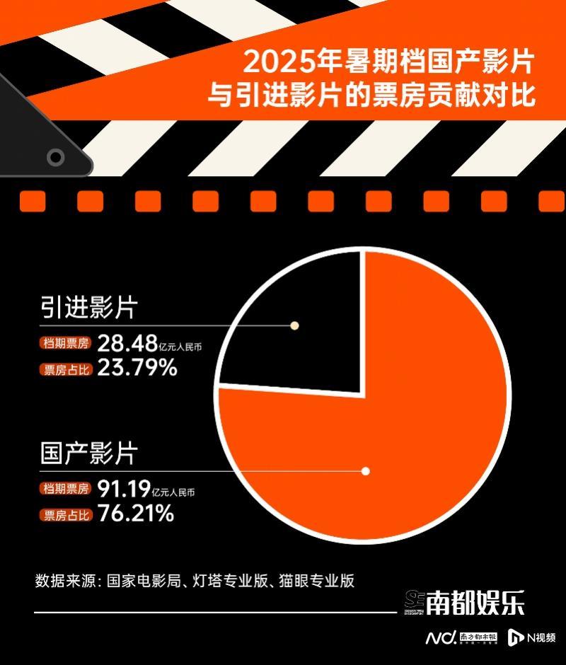 根据国家电影局统计,2025年暑期档电影票房为119.66亿元,观影人次为3.21亿,同比分别增长2.76%和12.75%,国产影片票房占比为76.21%,引进片占比为23.79%。