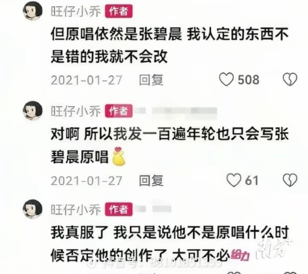 而她当时在评论区面对网友标注原唱的提醒时发表的“原唱依然是张碧晨,我认定的东西不是错的我就不会改”“发一百遍年轮也只会写张碧晨原唱”等言论近日被翻出,这场原唱之争就此拉开帷幕。