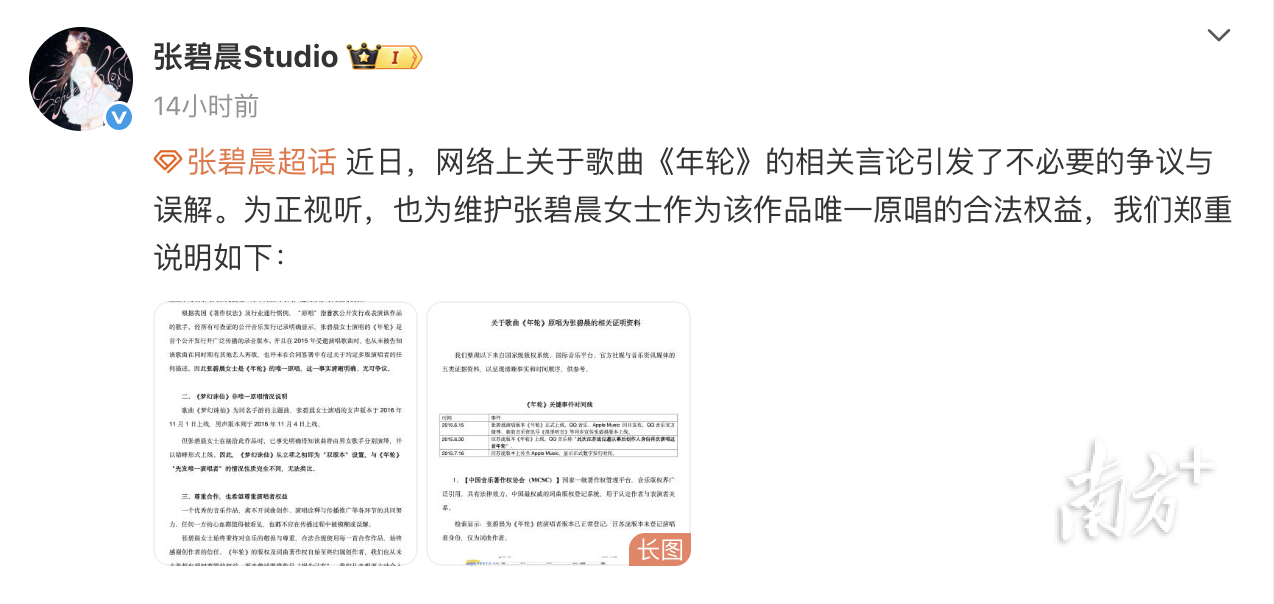 在汪苏泷宣布收回《年轮》授权后,张碧晨工作室在微博声明中附上自行整理的资料佐证张碧晨为《年轮》的“唯一原唱”,其中包括张碧晨版《年轮》上线时间较早,以及中国音乐著作权协会、中国标准录音制品编码中心等机构对该歌曲的登记信息等。