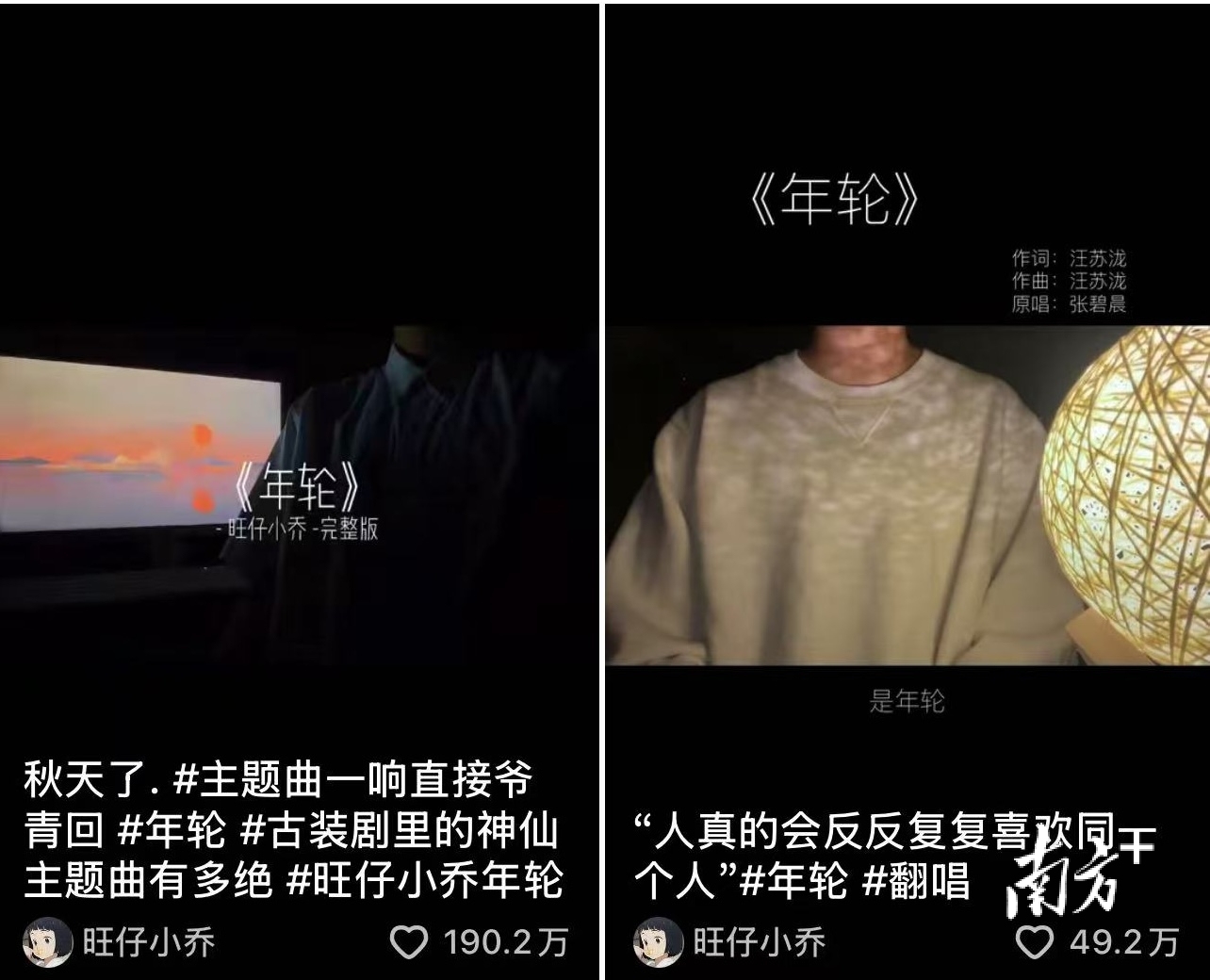 小南在“旺仔小乔”的短视频账号中搜索关键词“年轮”,发现她曾在2021年上传过两则翻唱《年轮》的视频,其中一则未标注歌曲作者和演唱者信息,另一则标注了“作词:汪苏泷 作曲:汪苏泷 原唱:张碧晨”。