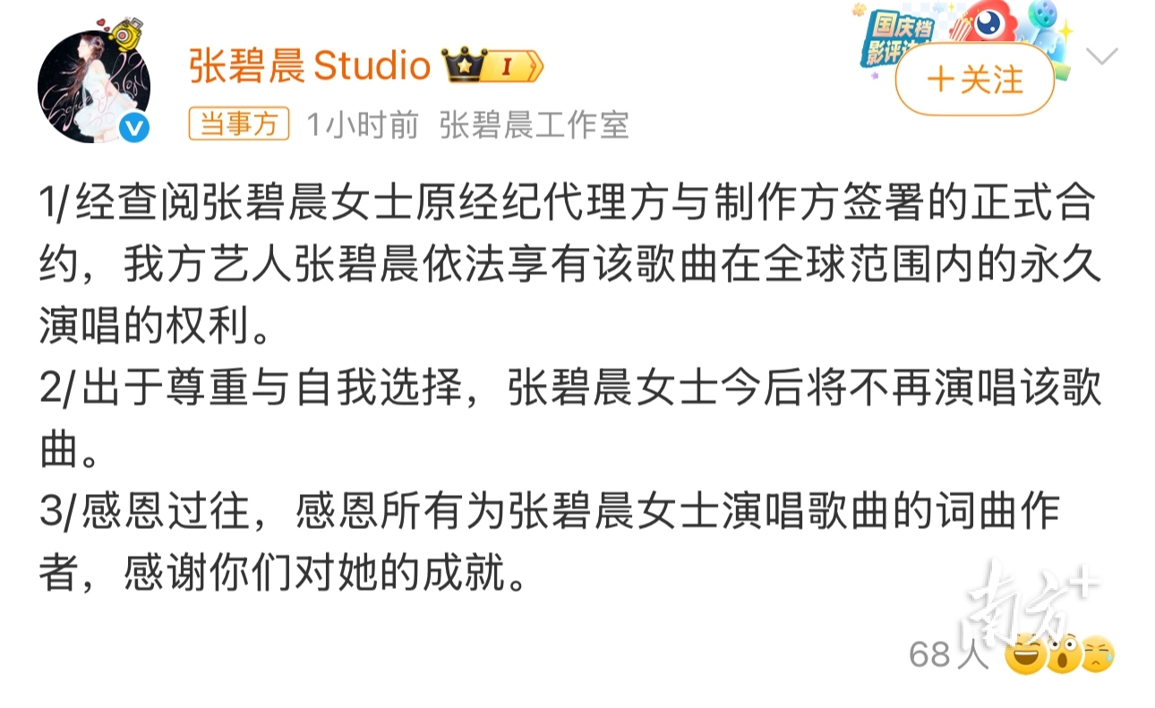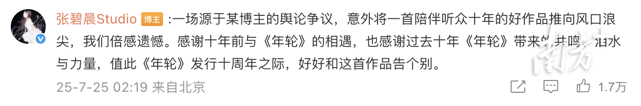 7月25日晚,张碧晨工作室继续补充声明:经查阅合约,张碧晨依法享有《年轮》在全球范围内的永久演唱权利,但出于尊重与自我选择,张碧晨今后将不再演唱该歌曲。