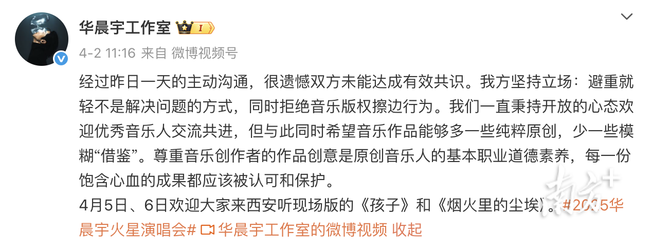 4月2日,华晨宇工作室发文称经过一天的主动沟通,双方未能达成有效共识。华晨宇方表示避重就轻不是解决问题的方式,同时拒绝音乐版权擦边行为。