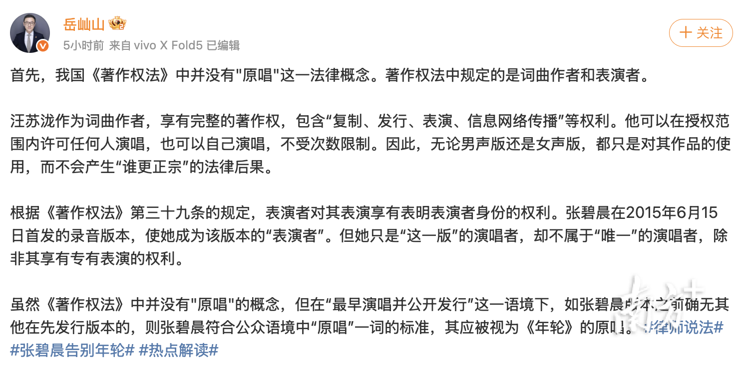 通常情况下,“原唱”是指词曲作品首次公开发行时由创作者或其指定合作者完成首个录音版本的行为主体,也可理解为一首歌曲的首唱者。原唱的核心特征为词曲作品的首次公开发表与录音载体化,表演者需为词曲作者或其授权合作人。而在行业实践中,原唱认定以时间优先为原则,即使创作者后续自行演唱,原唱身份仍归属首次发表者。在这种情况下,《年轮》的原唱应被认定为是张碧晨。
