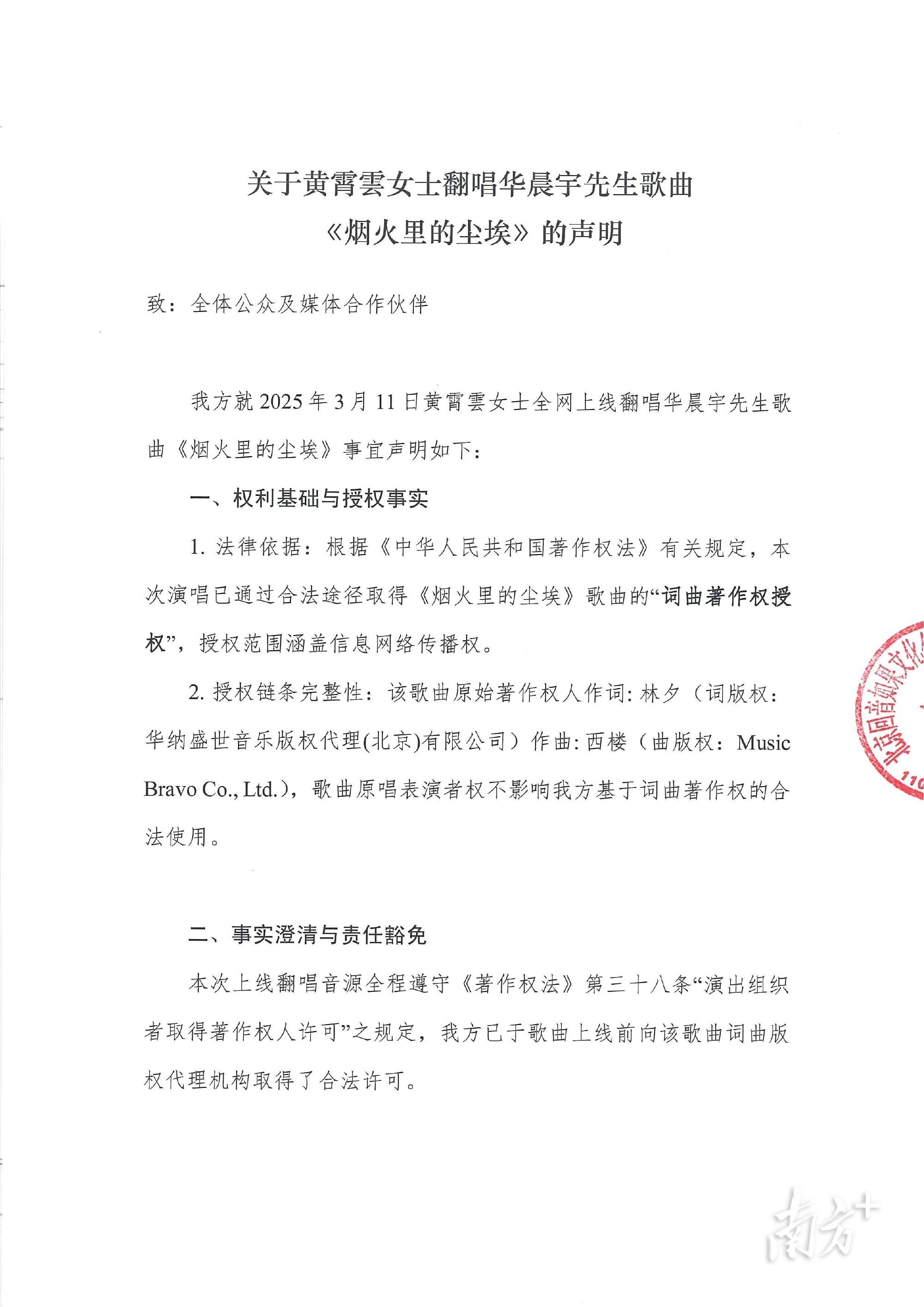3月31日,黄霄雲方严正声明,表示已通过合法途径获得华晨宇《烟火里的尘埃》的“词曲著作权授权”,“我方始终尊重音乐行业版权规则”,对于不实侵权指控、恶意诋毁声誉的行为,将依法追究名誉侵权责任。