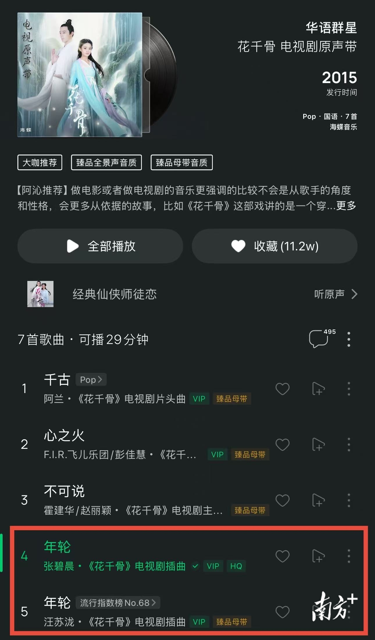 值得一提的是,张碧晨演唱的版本在2015年6月15日于QQ音乐平台上线,半个月后,也就是2015年6月30日,汪苏泷演唱的版本也在QQ音乐平台上线,这两个版本的《年轮》都属于正式发行的录音室作品,并且都收录于专辑《花千骨 电视剧原声带》中。