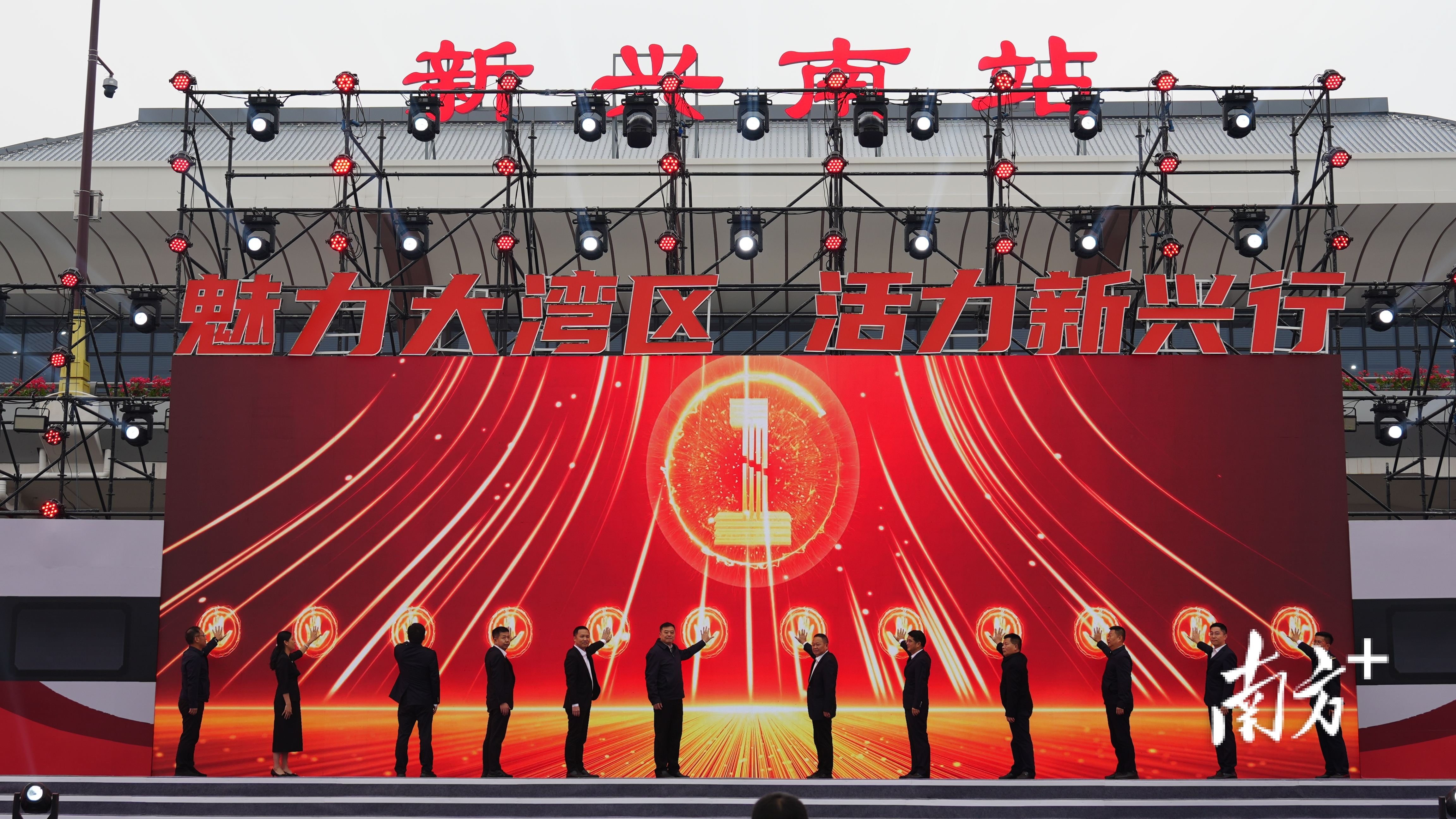 仪式上,梁绍雄、陈哲江、赖鉴铭等领导嘉宾一同点亮屏幕,标志着广湛高铁新兴南站正式启用,“魅力大湾区 活力新兴行”消费季活动正式启动,现场气氛热烈。