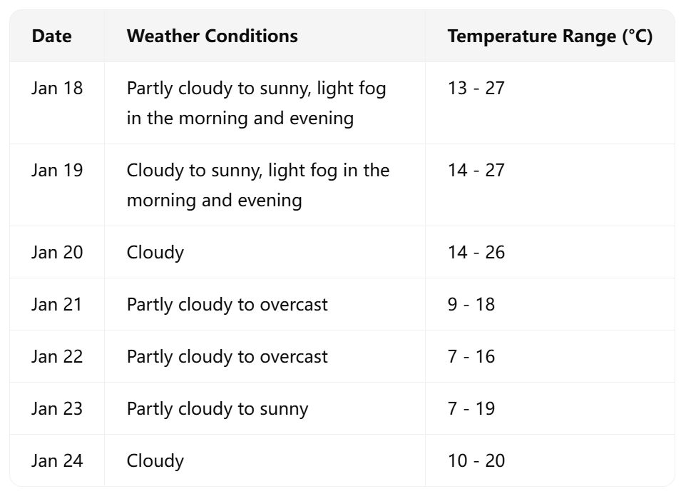 January 18–19: Mostly clear to cloudy across the province, with morning light fog in many areas and patches of dense fog in the west.
