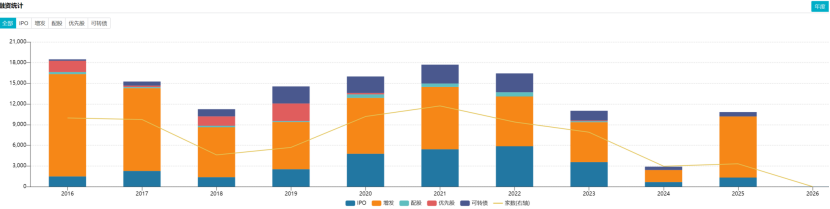 A股年度融资情况。(数据来源:wind)从融资结构来看,股权增发成为绝对主力。全年A股增发融资占比高达82%,合计规模8877.32亿元,其中四家国有银行获财政部注资,集中完成5200亿元增发,成为推动增发规模激增的核心因素。