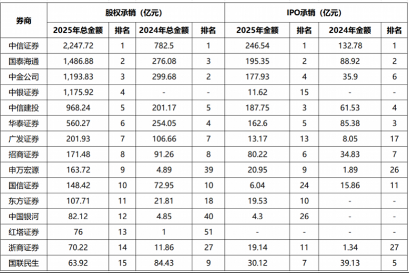 2025年,随着国泰君安吸收合并海通证券并新组建为国泰海通证券,“三中一华”长期主导的投行市场格局受到冲击。Wind数据显示,在2025年A股融资中,中信证券股权承销金额以2247.72亿元保持第一;国泰海通则直接登上第二(2024年国泰君安、海通证券分别排名第4、第5),承销金额为1486.88亿元。