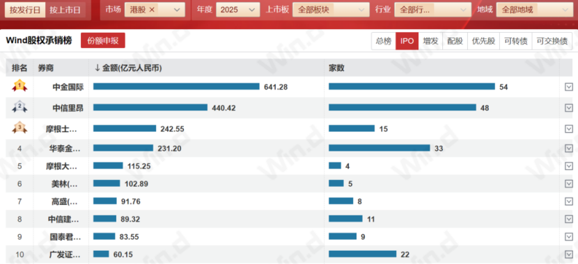 数据来源:wind2025年,“国际化”成为证券行业关键词,随着港股上市热潮涌动,多家券商港股IPO承销规模实现翻倍式增长。其中,中金国际全年承销港股IPO项目641.28亿元,同比增长1.9倍,继续占据市场第一;中信里昂、华泰金控香港、中信建投国际、国泰君安国际、广发证券香港承销金额分别为440.42亿元、231.2亿元、89.32亿元、83.55亿元、60.15亿元,跻身市场前10,同比分别增长7.5倍、3.8倍、2.4倍、8.4倍、2.1倍。
