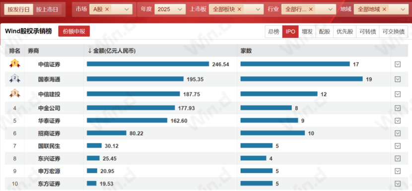 在市场关注度较高的IPO承销领域,2025年,中信证券、国泰海通A股IPO承销金额分别以246.5亿元、195.4亿元位居前二;中信建投、中金公司、华泰证券分列第3至第5,承销金额均超160亿元,大幅领先第6名的招商证券(80.22亿元),头部效应明显。