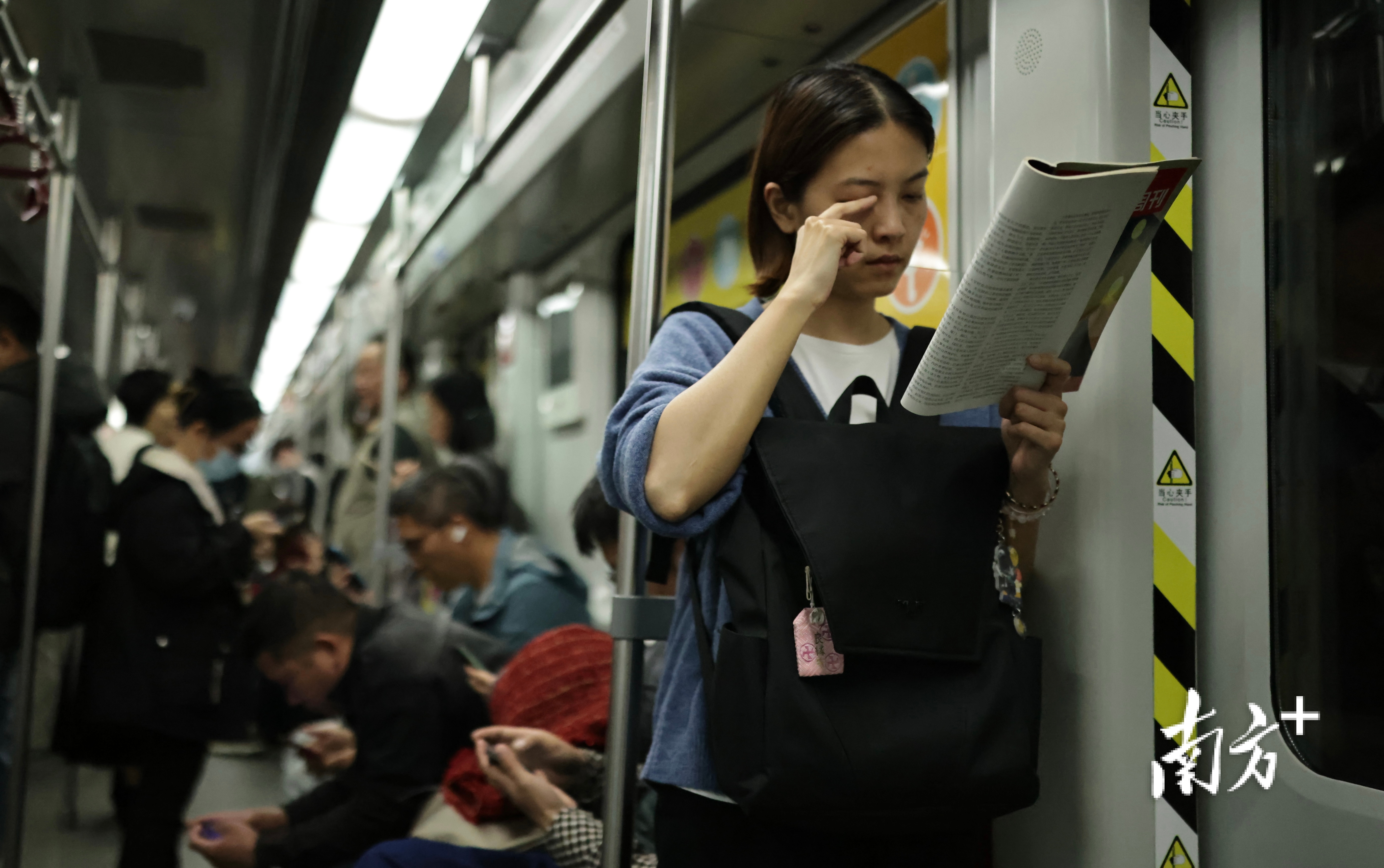 1月29日,广州地铁2号线车厢内,一名女孩倚靠车厢专注阅读书籍。