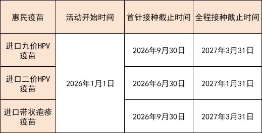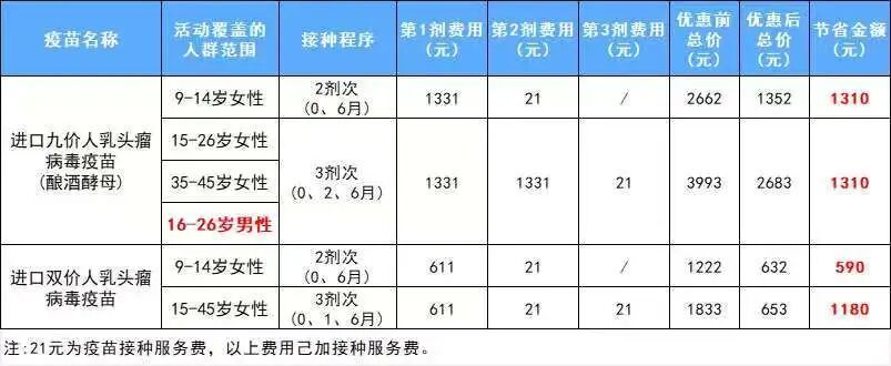 其余年龄在规定时间内,按照0、2、6个月的程序完成九价HPV疫苗接种,可减免最后一剂疫苗费用;或按照0、1、6个月的程序完成双价HPV疫苗接种,可减免第二、三剂疫苗费用。