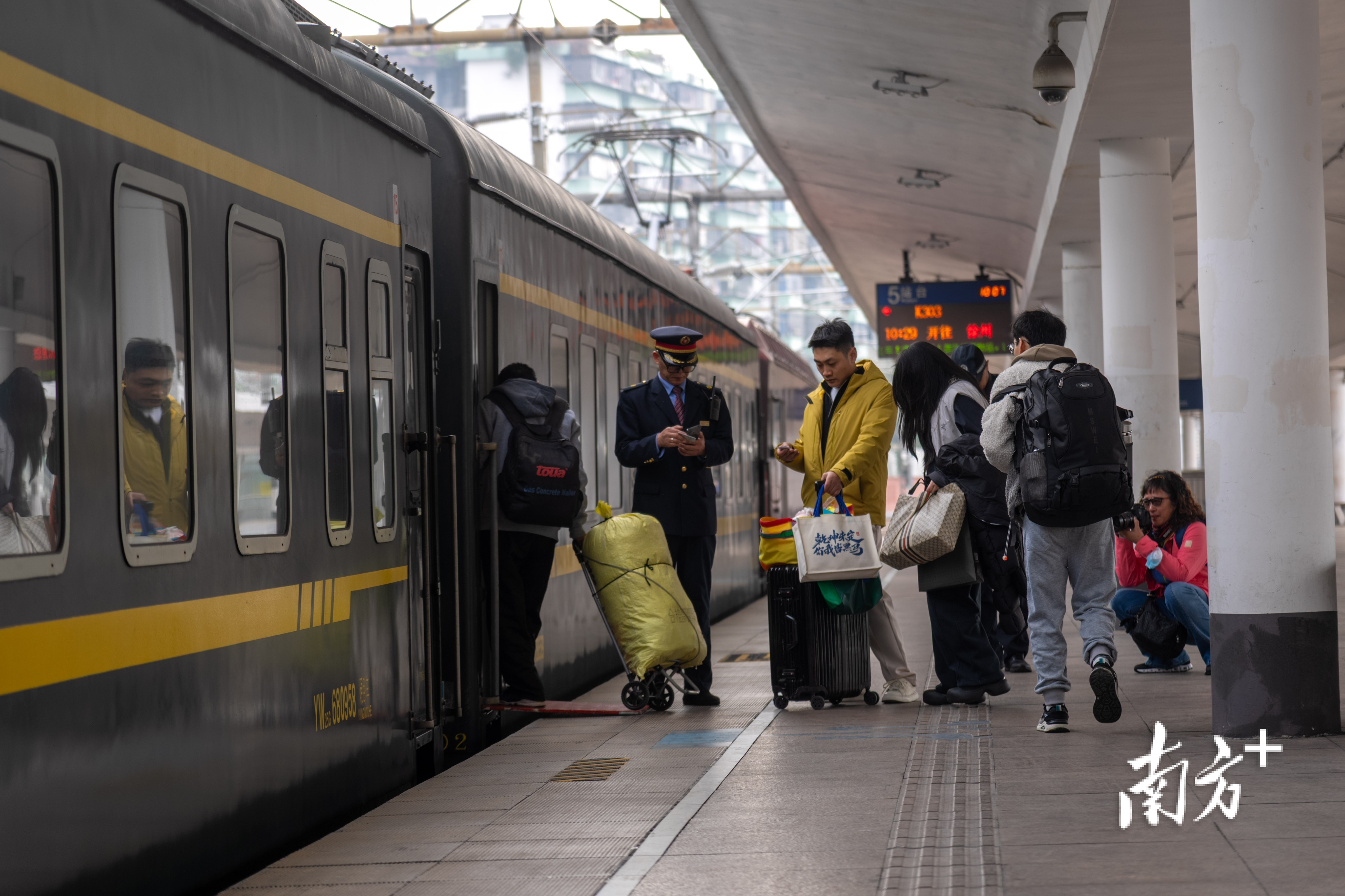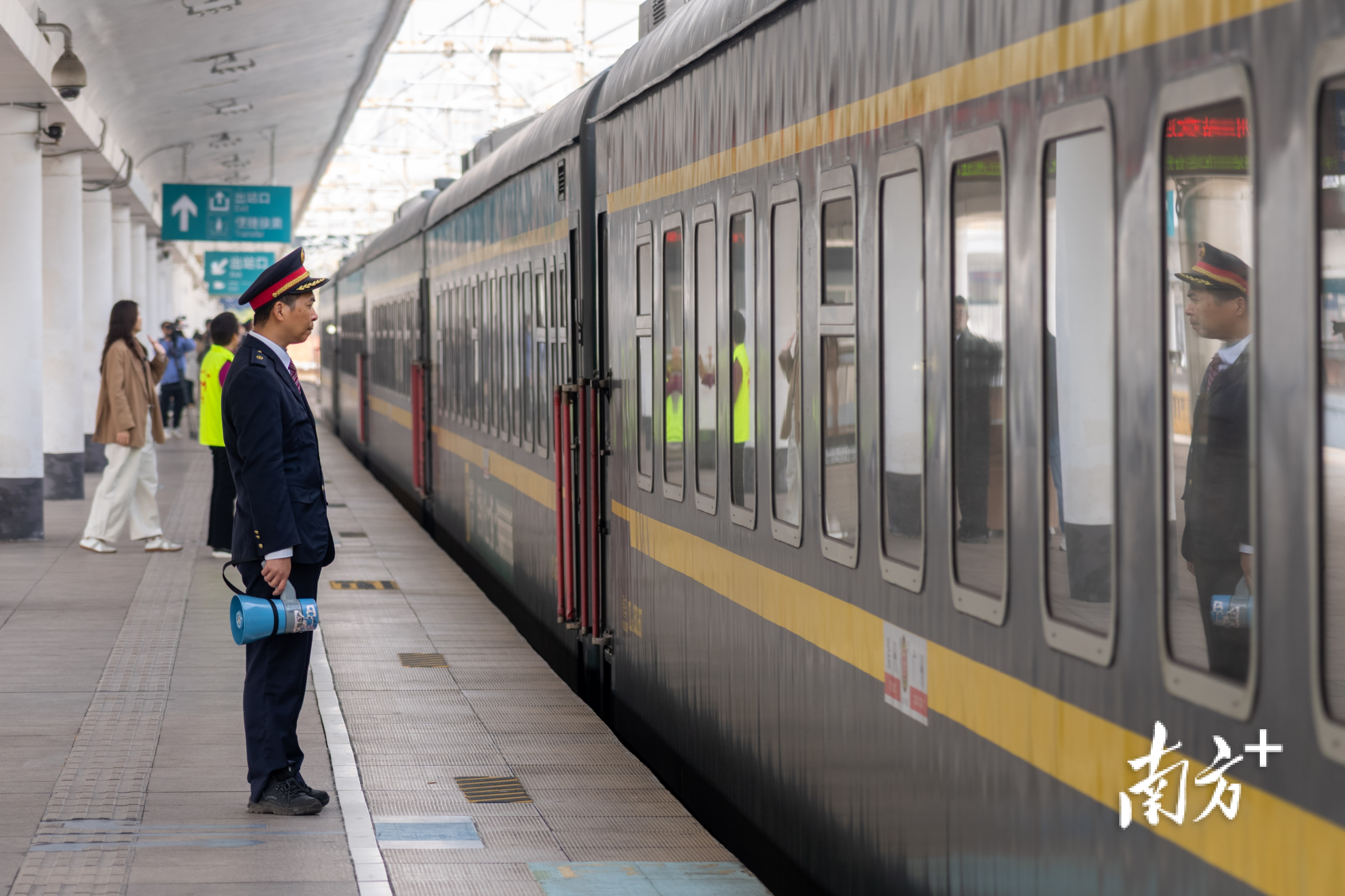 车站工作人员在发车前催促乘客登车。10时29分,K303即将驶离广州站。