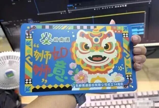 从网友分享的图片可以看到,这张羊城通的尺寸远超普通卡片(普通羊城通尺寸和身份证大小相仿),不仅长度与地铁闸机刷卡区的宽度相当,整体面积也接近一台笔记本电脑的四分之一。卡另一面印有可爱狮子图案及“狮狮如意”“广东岭南通股份有限公司成立14周年”字样。
