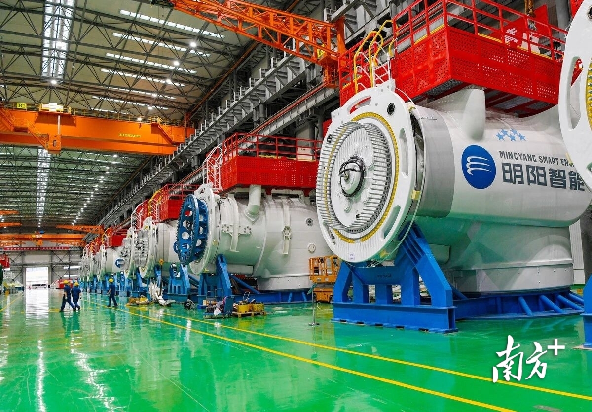 依托海上风电开发的领先优势,阳江积极打造全球领先的风电装备全产业链。以省政府批准建设的广东阳江国际风电城为核心,阳江集聚了风机整机、叶片、塔筒、海缆等关键环节的40个重点项目,总投资超400亿元,形成了国内产业链最完整、全球具有重要影响力的风电装备制造和出口基地。“其中,本地生产的风电装备如明阳、金风、龙马等企业装备不仅服务全国,还远销海外多个国家和地区,实现了从‘阳江制造’到‘阳江出口’的跨越。”阳江市发改局局长黄锐国介绍。
