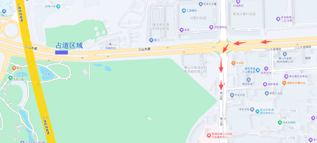 2、三山大道平洲至三山方向(紫框所示):三山大道广珠西高速公路至加油站路段,时间段00:00-06:00。