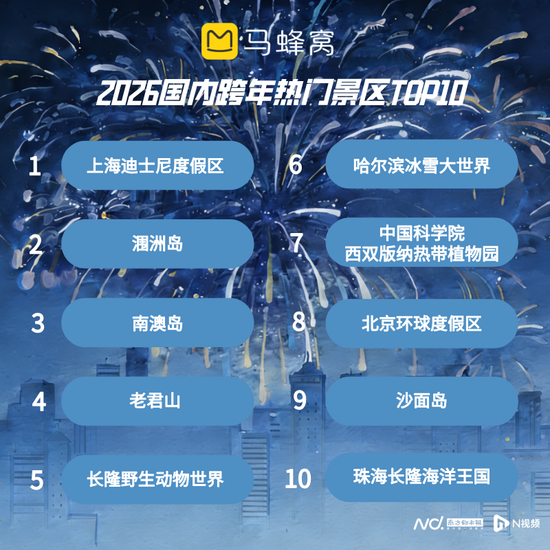 上海迪士尼度假区、涠洲岛、南澳岛、老君山、长隆野生动物世界、哈尔滨冰雪大世界、中国科学院西双版纳热带植物园、北京环球度假区、沙面岛、珠海长隆海洋王国位列马蜂窝跨年热门景区榜单前十,以上海迪士尼为首的主题乐园占据半数。除了“疯狂动物城主题园区”,迪士尼每年的跨年梦幻烟花秀同样备受期待。17日正式开园的哈尔滨冰雪大世界在未开时就已凭借群星荟萃的跨年演唱会赚足眼球,冰雪与热情融合的独特体验带动其热度月环比大涨300%。珠海长隆海洋王国则计划在新年前夜连办三场主题烟花秀,搭配明星演唱会,用视听狂欢迎接2026年的到来。