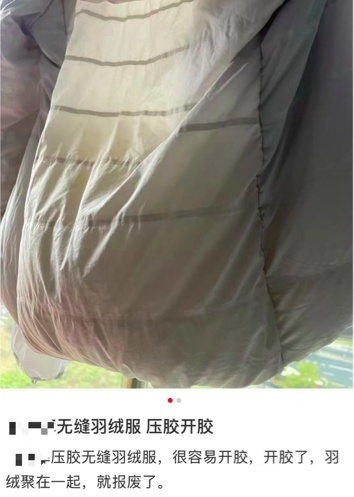 网友晒出自己开胶的无缝羽绒服丨小红书/大方芝士