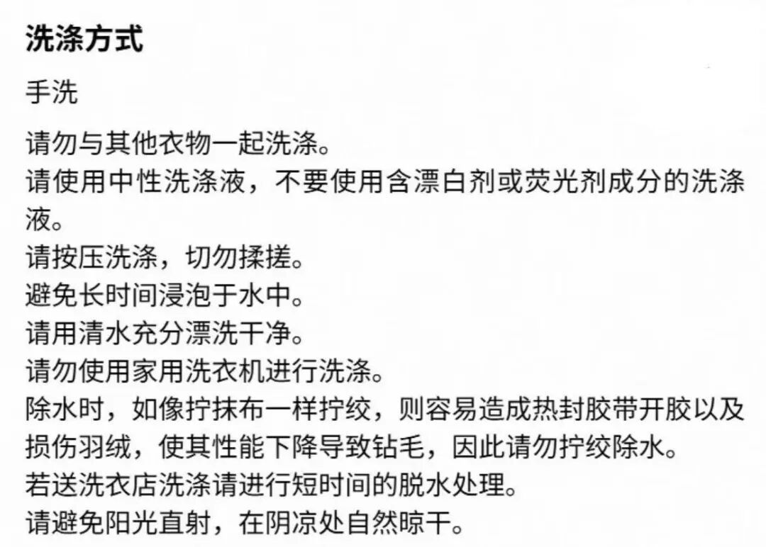 “粘贴式”无缝羽绒服的洗涤方式说明丨电商截图