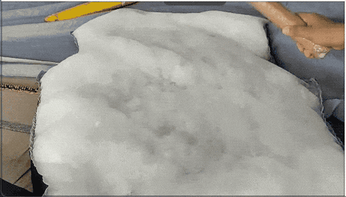 有些羽绒服是先给一大块布料兜子充绒,再给这块“羽绒被”做绗缝,最后裁剪成衣服。