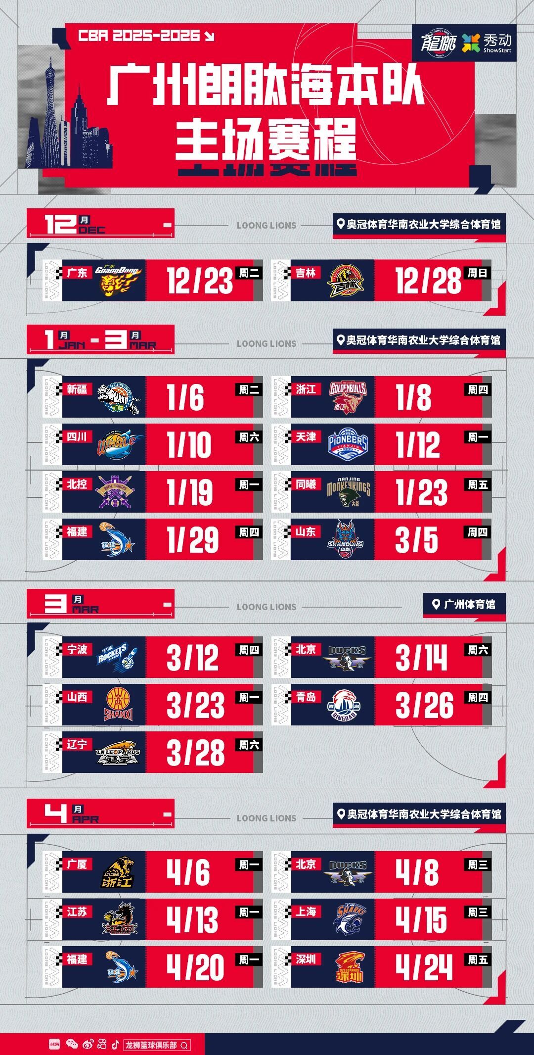 广东三家俱乐部的赛程已全部出炉。广东东阳光首战将对阵南京天之蓝男篮,比赛将于12月14日打响;广州朗肽海男篮首战对阵广东东阳光,比赛将于12月23日打响;深圳马可波罗男篮将在12月13日坐镇主场,迎来与青岛队的赛季首战。
