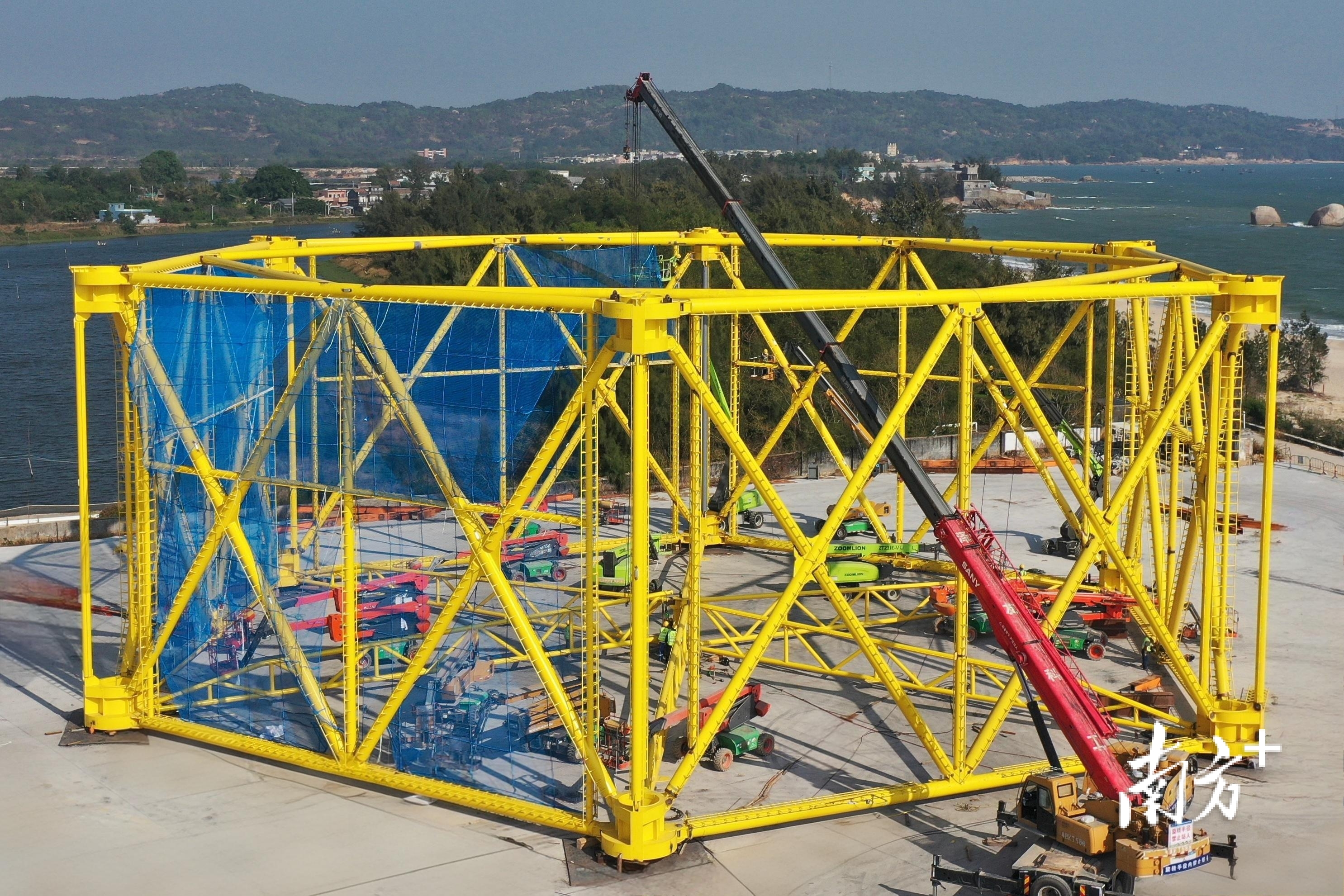 近日,由中交广航局交建公司承建的省港航集团海洋牧场(汕尾)项目迎来重大节点,首座桁架式网箱六大面模块及底部桁架拼装工作顺利完成,施工进度取得关键突破,正式进入二层平台结构、桩腿等附属设施施工的新阶段。