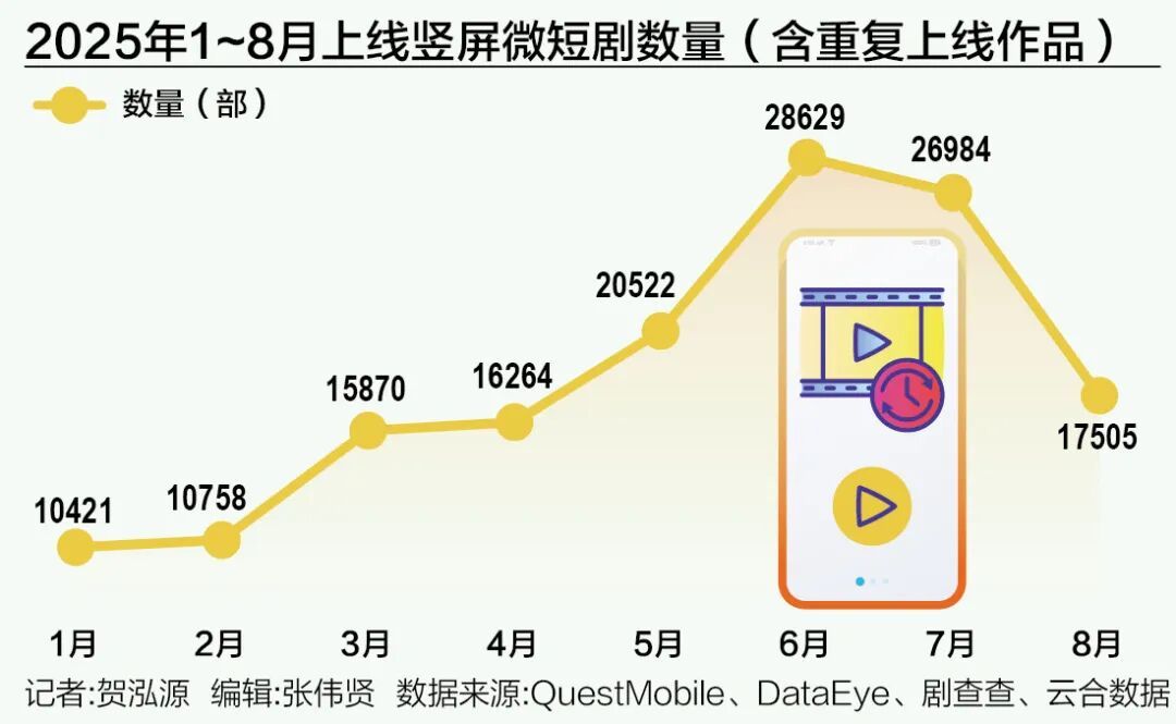 中国网络视听协会数据显示,2025年1—8月,短视频平台、小程序和微短剧应用共上线竖屏剧14余万部,这一数量的急速增长主要缘自部分剧集的重新剪辑、复投上线,若去掉该部分内容,结合行业调研及综合评估, 预计2025年全年独立完整制作并上线的竖屏剧数量约为4万部。