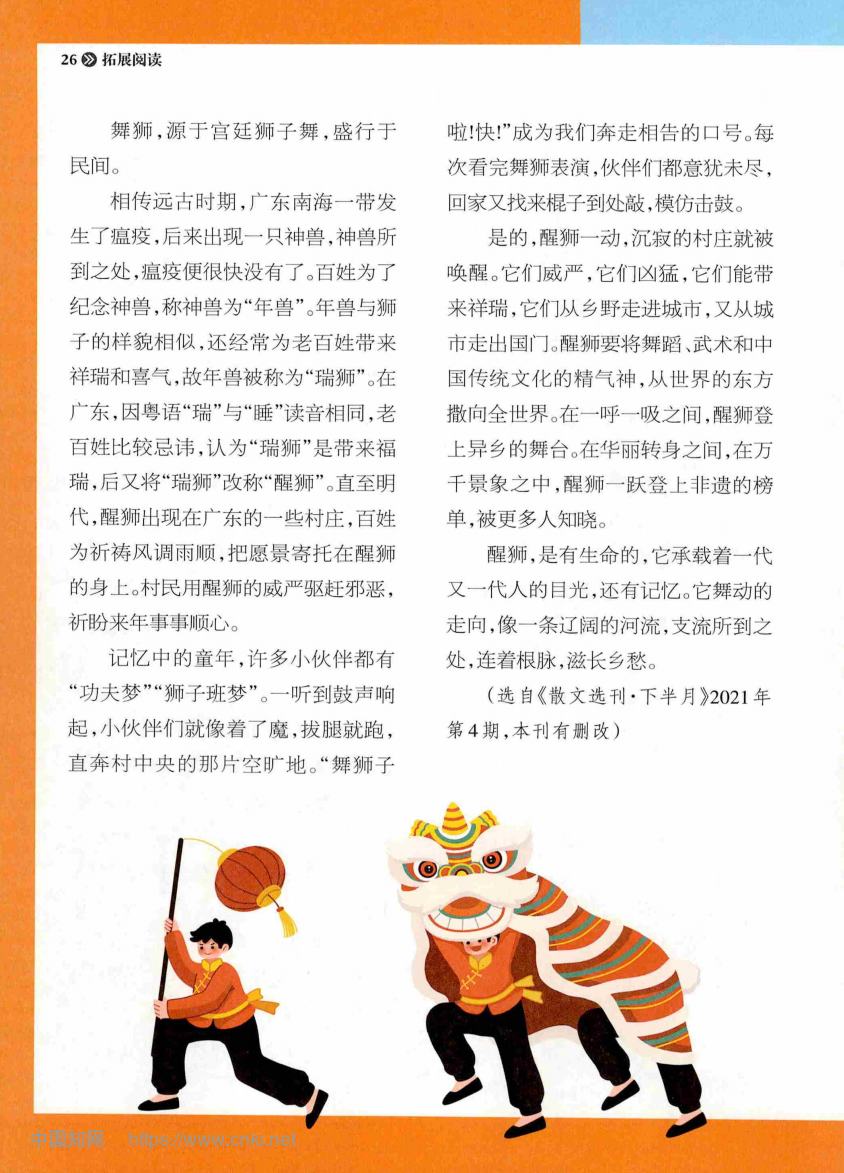 《舞动的醒狮》以岭南乡村舞狮为核心意象,表达了对故乡的深切眷恋、对传统文化的热爱与传承之愿,以及对乡土生命力与民族精神的礼赞。该作品原载《散文选刊·下半月》2021年第4期(转载时有删改)。据悉,此前,该作品还被《作文周刊》《作文素材.品读经典》转载和选为中学语文现代文阅读题。