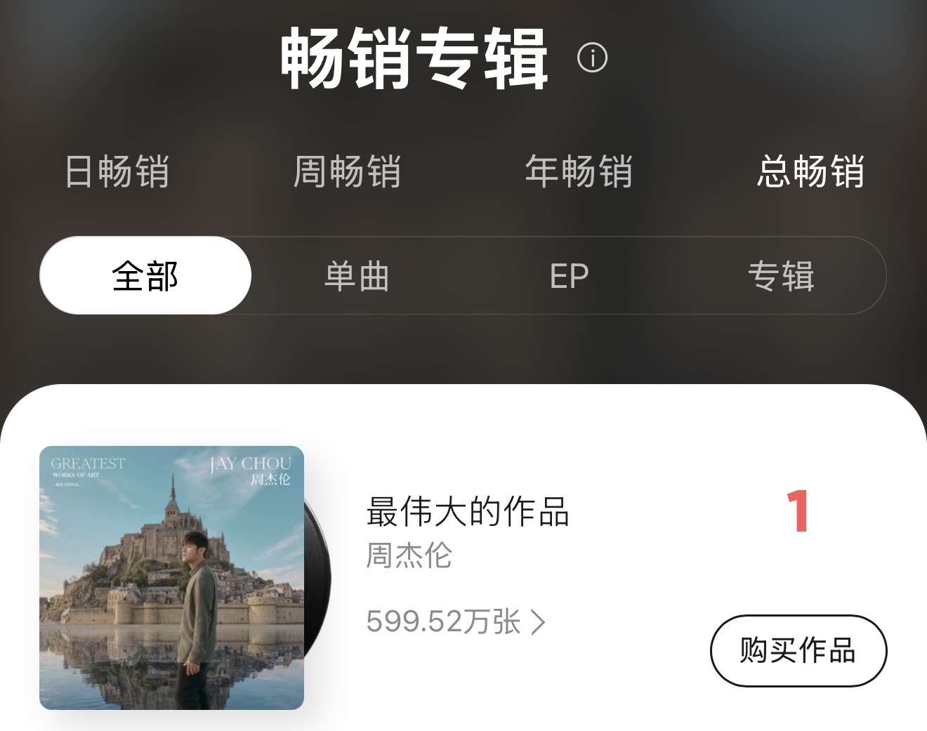 而周杰伦上一张专辑《最伟大的作品》在QQ音乐销量达到599.92万张,销售额近1.8亿元,目前仍位居QQ音乐数字专辑销售总榜榜首。