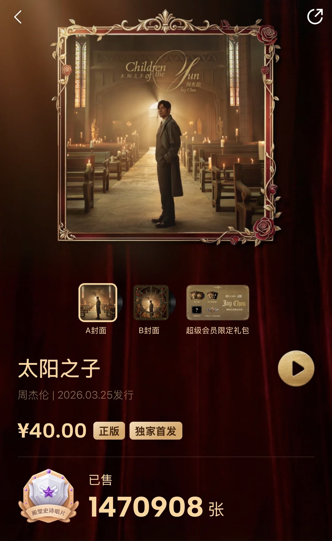 3月25日凌晨,周杰伦暌违3年8个月推出的全新专辑《太阳之子》在全球数字上线。截至25日13时10分,该专辑在大陆地区独家音乐平台QQ音乐销量已突破147万张,销售额超5800万元,达成“殿堂史诗唱片”成就。