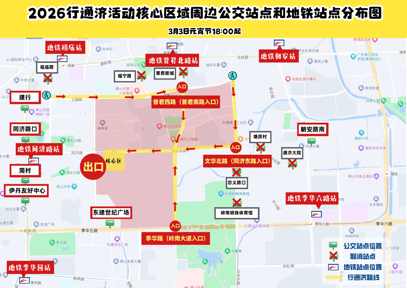 在3月3日元宵节当晚18时实施交通管制后,乘坐公交参与活动的市民游客,可在建新路、兆祥路、朝安路、季华路、汾江路上的公交站点下车后,步行进入行通济路线参与活动。