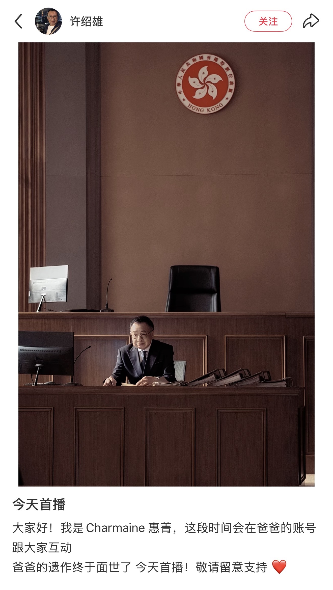 《正义女神》开播之际,许绍雄的女儿许惠菁也通过许绍雄的社交账号发布剧集相关信息,并表示这段时间会在爸爸的账号跟大家互动。