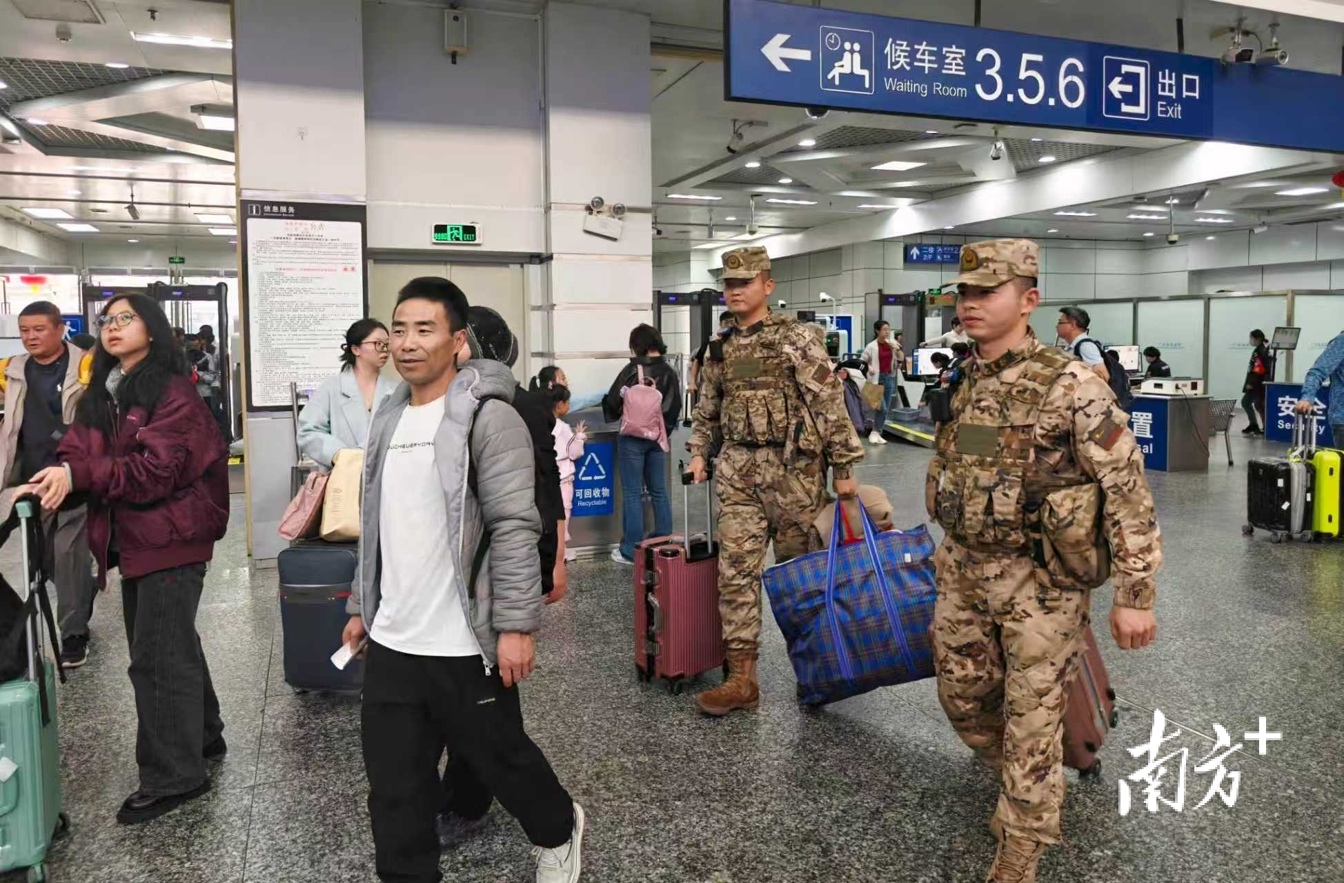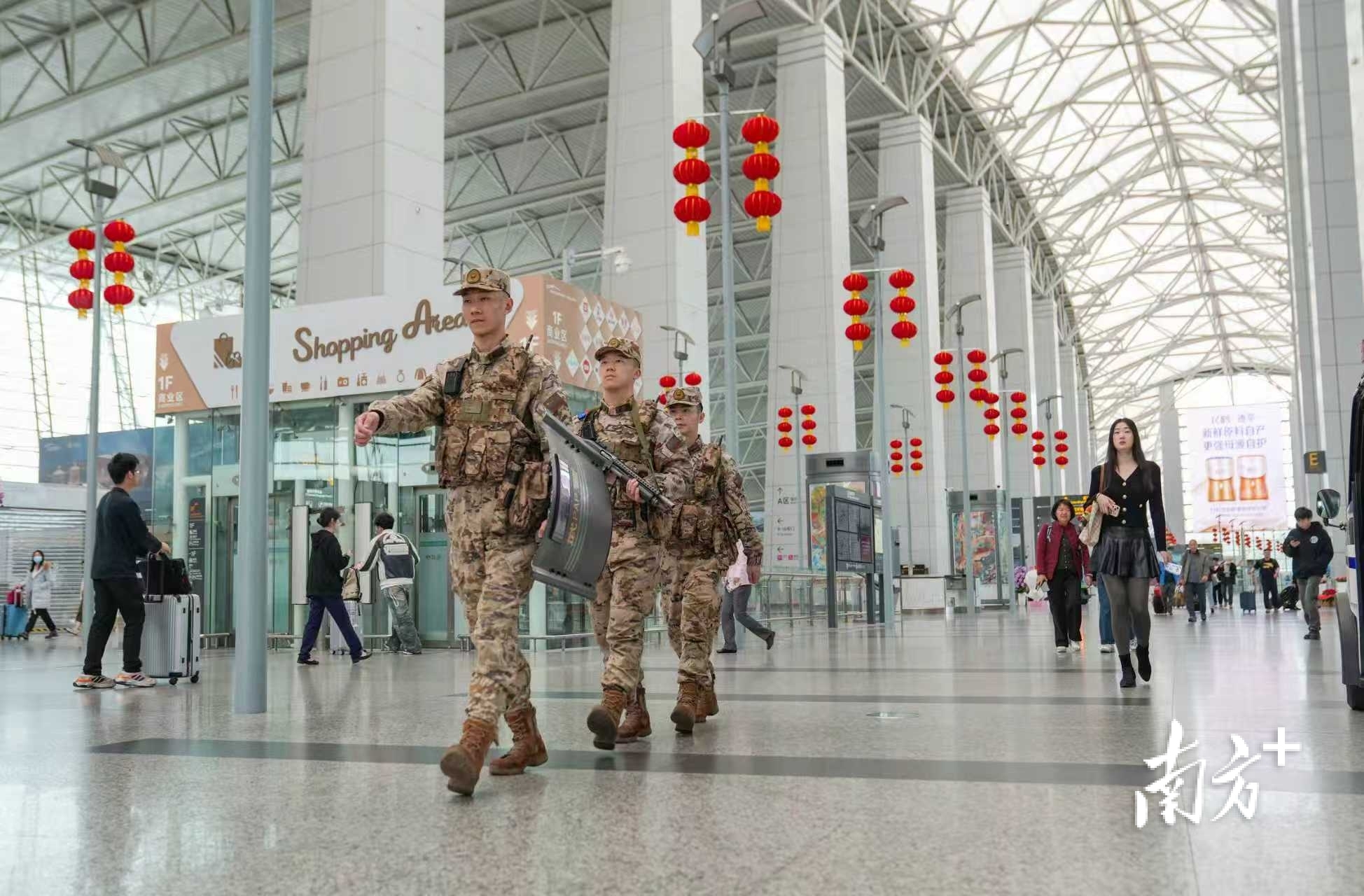 近日,春运进入返程高峰,广州各大交通枢纽客流攀升。武警广州支队的官兵们坚守岗位,为旅客的平安返程筑牢安全屏障。