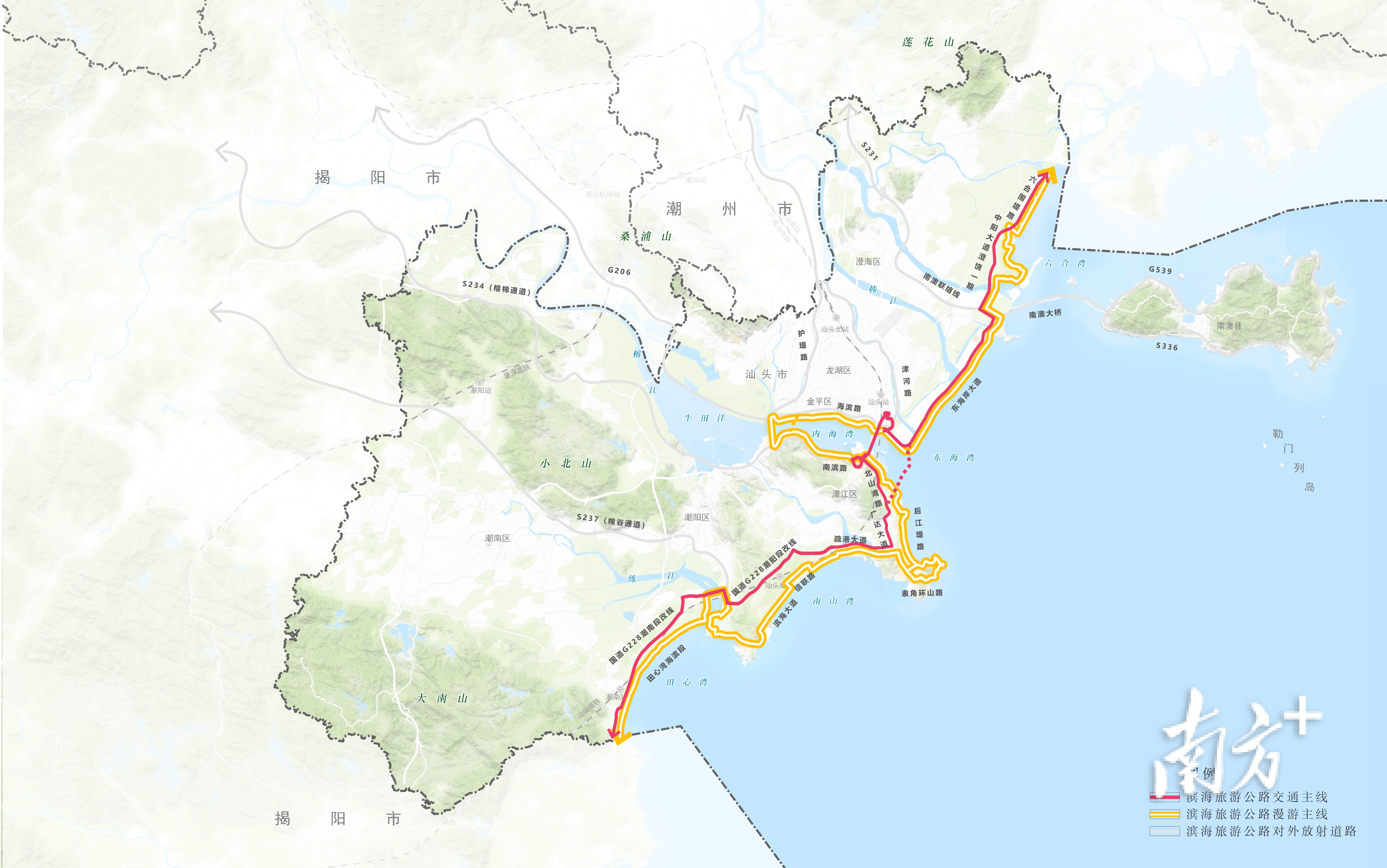 这条公路并非单纯的交通动脉,更是融汇山海资源、统筹城乡协同发展的战略轴带,将深度推动汕头文旅、康养、商贸、渔业、乡村振兴等多业态深度融合、协同发展。根据规划,汕头滨海旅游公路北接饶平、南连惠来,贯穿全市五个行政区和两个功能区,一路串联澄海义丰溪、莱芜半岛,华侨试验区东海岸新城,龙湖鸭寮湾、妈屿岛,濠江北山湾、表角、南山湾,潮阳海门镇、莲花峰,潮南井都镇、十里银滩、田心湾等核心景观节点,实现山海风光与城市风貌的无缝衔接。