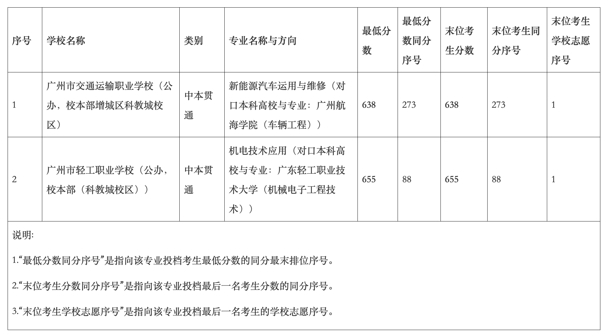 中职三二分段及省级以上重点特色专业紧密对接“12218”现代化产业体系,今年报考人数较往年有明显增加,共录取15040人,其中普通高中录取最低控制线上考生5823人,录取人数和计划完成率大幅提升。广东省食品药品职业技术学校、广州市医药职业学校、广州市轻工职业学校、广州市信息技术职业学校、广州市旅游商务职业学校、广州市财经商贸职业学校、广州市交通运输职业学校、广州市城市建设职业学校、广州市番禺区新造职业技术学校等学校的药剂、动漫与游戏制作、人工智能技术与应用、物联网技术应用、机电技术应用、工业机器人技术应用、无人机操控与维护、新能源汽车制造与检测、城市轨道交通、数控技术应用、计算机网络技术、电子商务、中西面点等289个专业招生计划完成率100%。