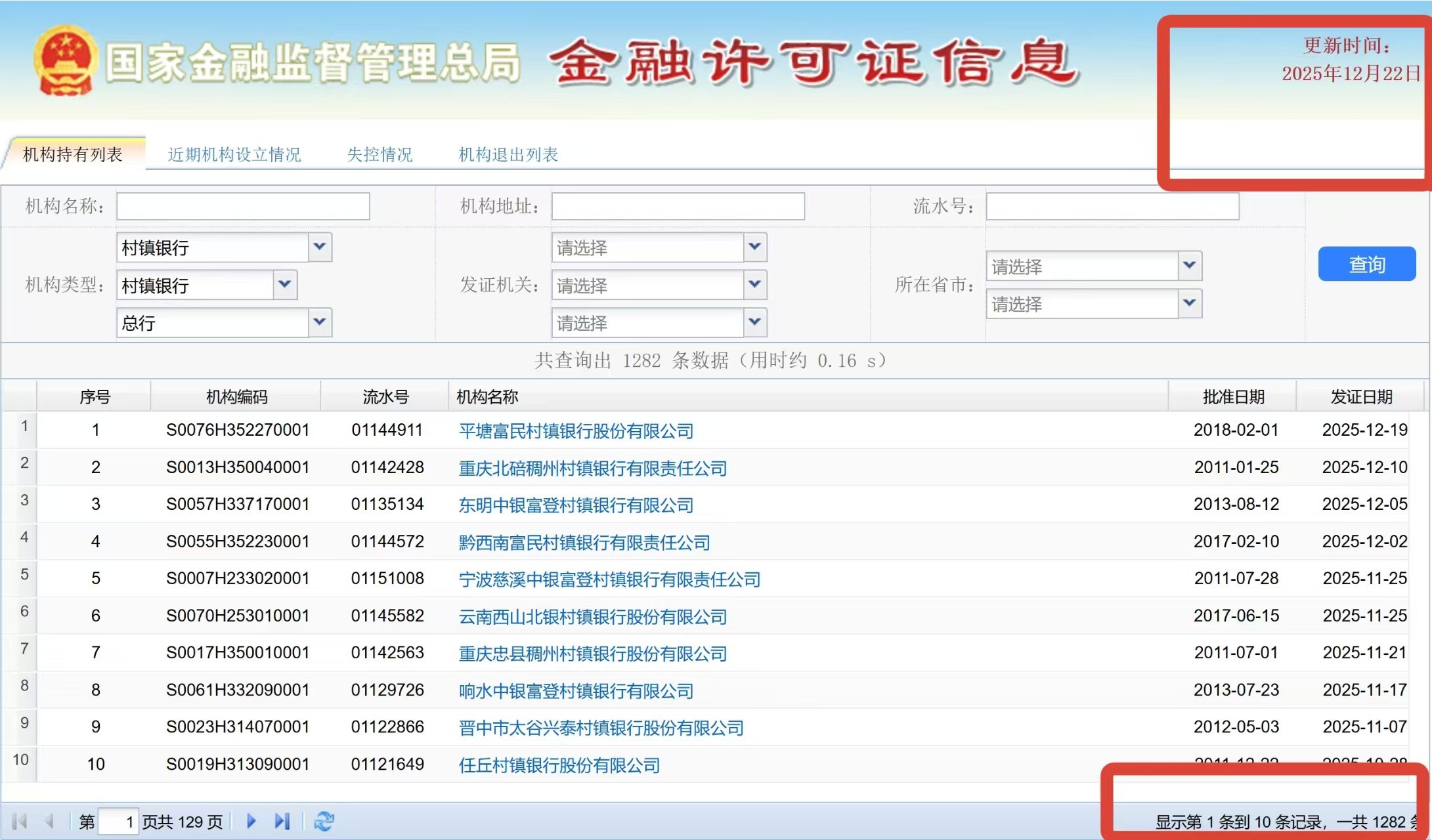 村镇银行“减量”正在提速。国家金融监督管理总局最新数据显示,截至12月22日,全国村镇银行总数为1282家,较上周减少19家。以2024年末我国村镇银行数量为1551家算,近一年内我国完成注销退出的村镇银行达269家。