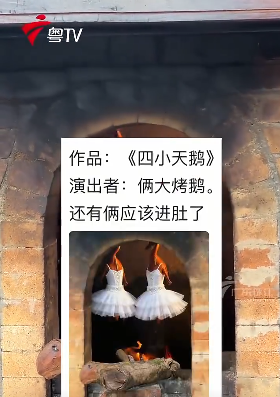 近日,一条网友拍摄的烤鹅视频走红。画面可见有两只烤鹅在炉中旋转烘烤,被创作者配上了《天鹅湖》的音乐,搭配效果出乎意料,让人忍俊不禁。
