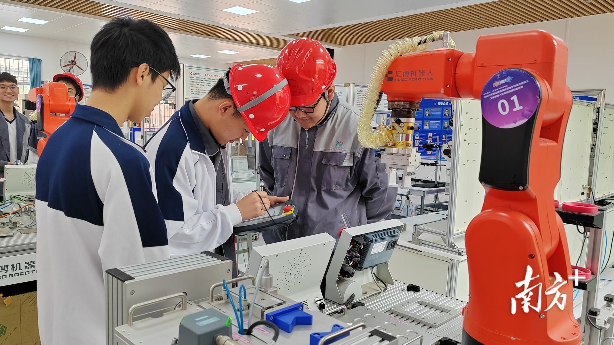 南海区信息技术学校学生在产业学院学习机器人操作。