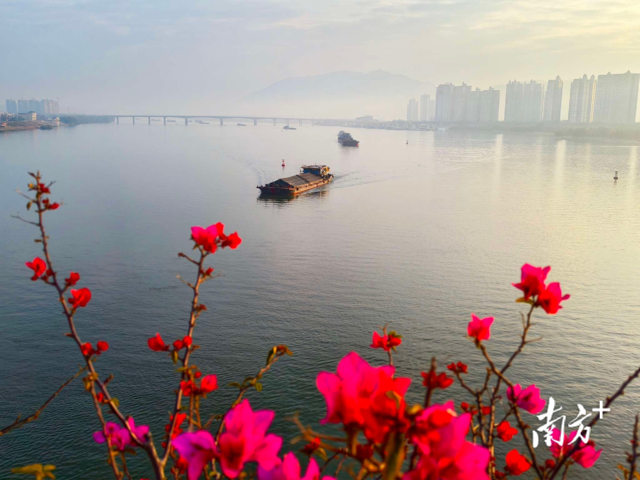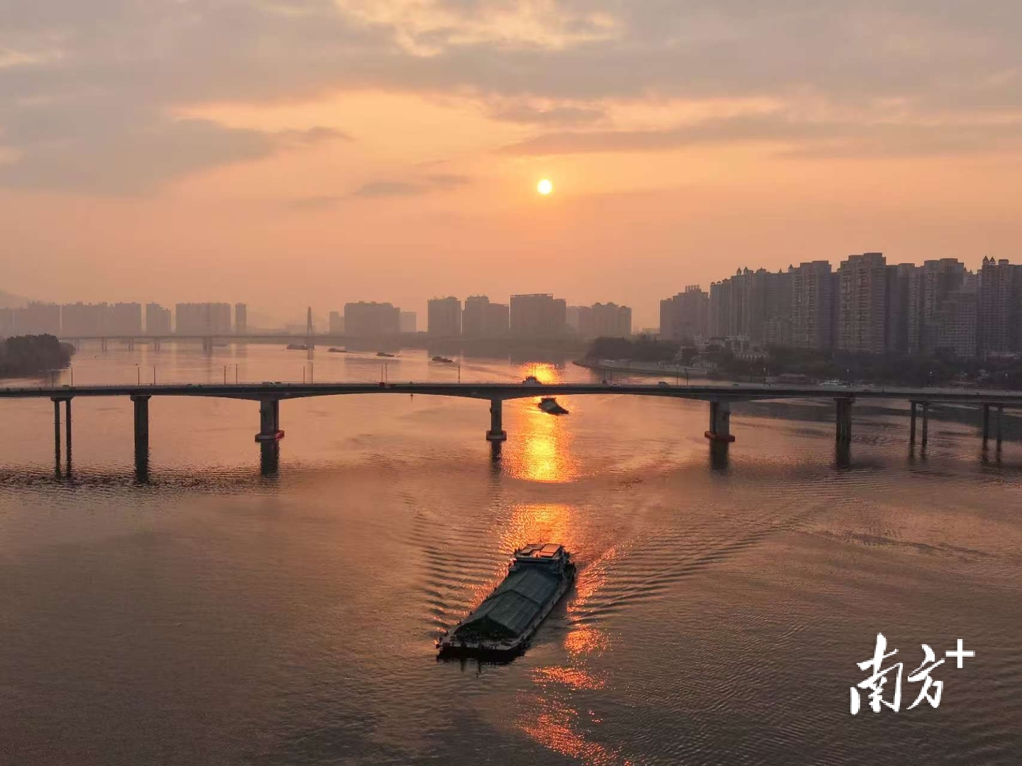 12月30日,清远市清城区北江,满载货物的大船在朝霞中驶向清远港。南方+拍客 阿俊 摄