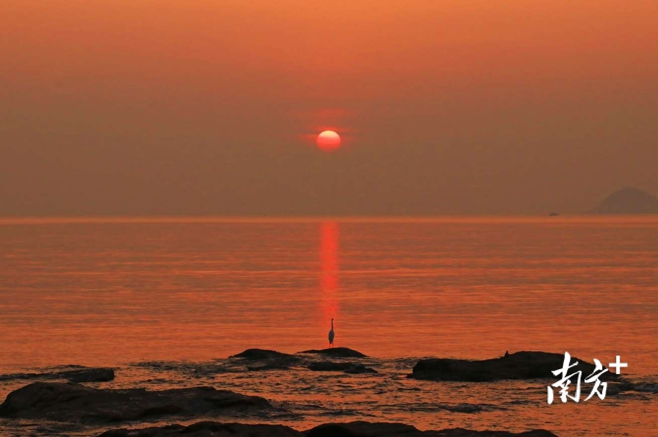 12月30日,珠海市野狸岛,一只白鹭站在礁石上观看日出。南方+拍客 林集源 摄
