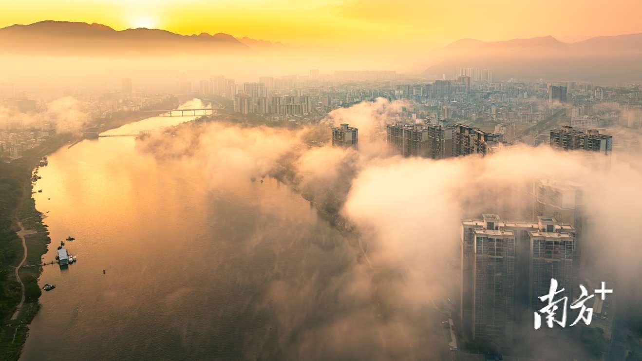 12月29日早晨,广东阳山县城江滨西路段被晨雾笼罩。南方+拍客 唐志光 摄