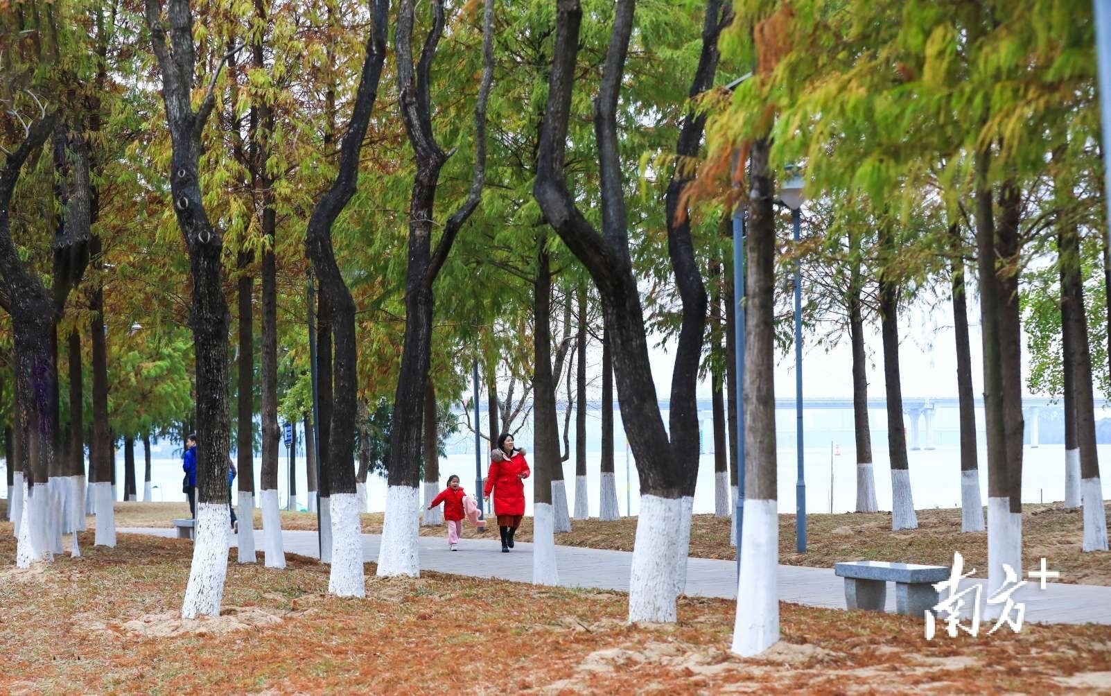 12月26日,清远市南岸公园,一对穿着红衣的母女在拍照游玩,红色给寒冬带来暖意。南方+客 阿俊 摄