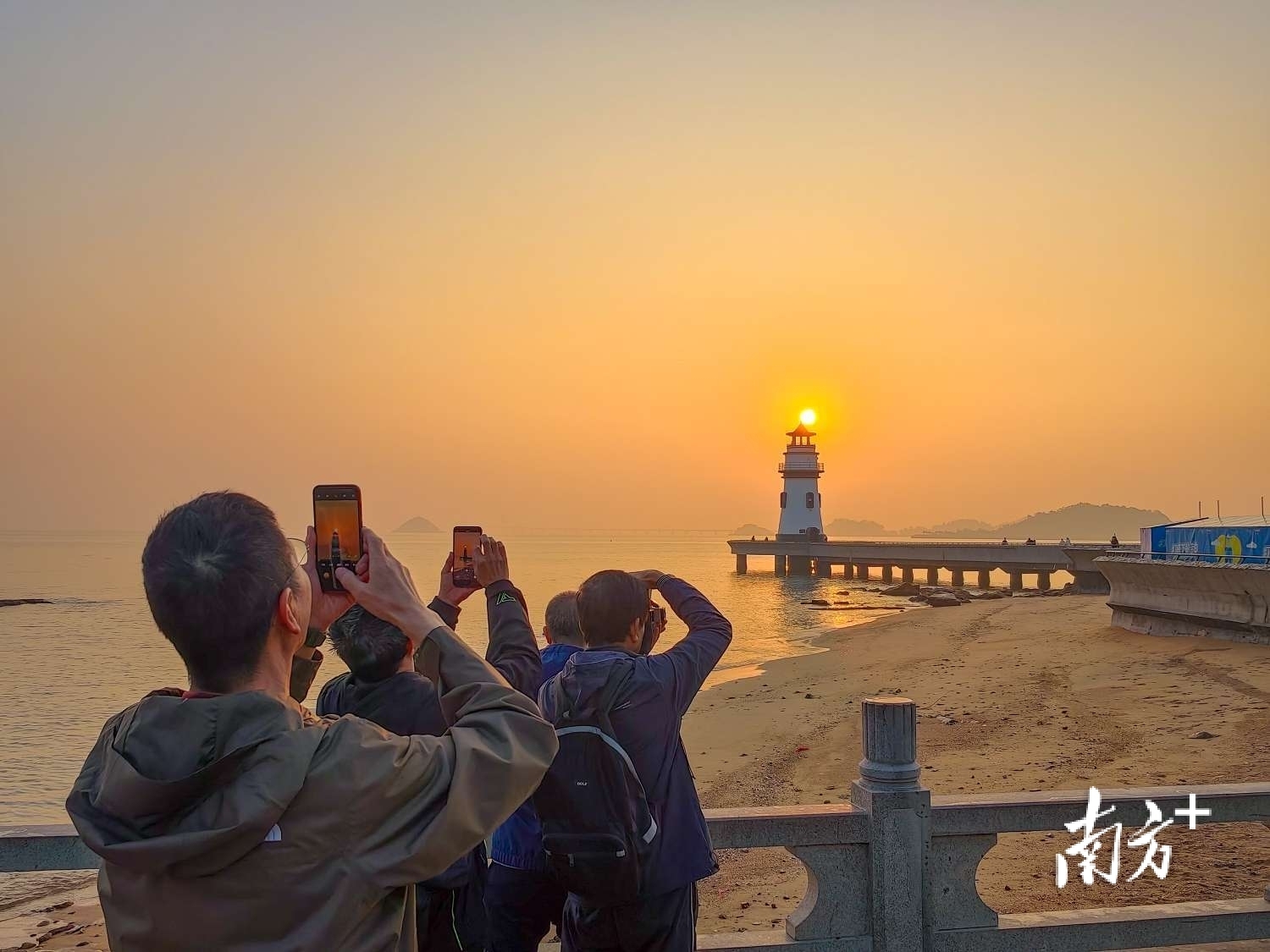 2025年12月29日晨,市民在拍摄珠海情侣路爱情灯塔穿日。南方+拍客 郑志刚 摄