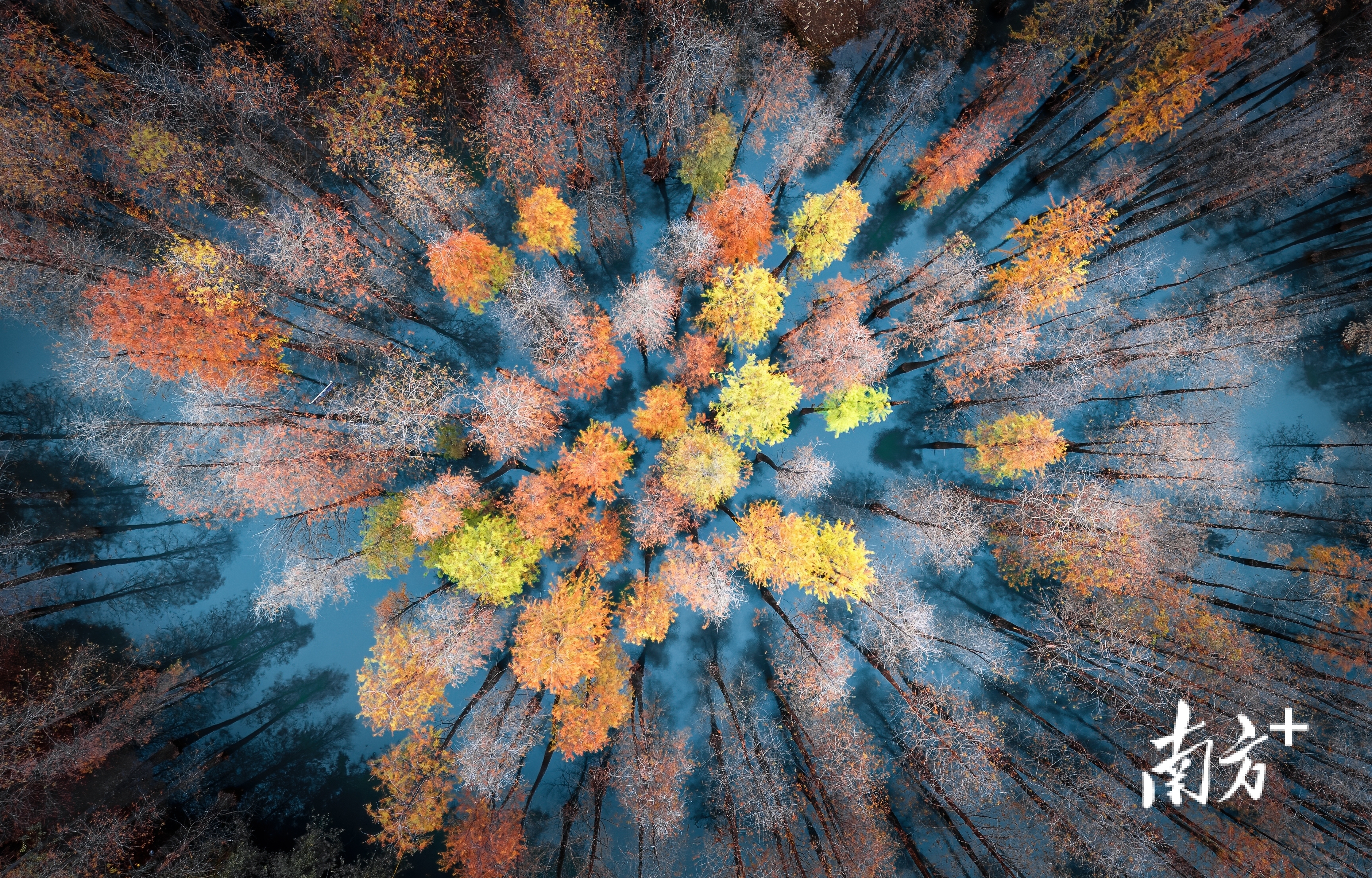 12月27日,中山石寨水库的落羽杉红透,焕发出迷人的色彩。南方+拍客 黄晓楠  摄