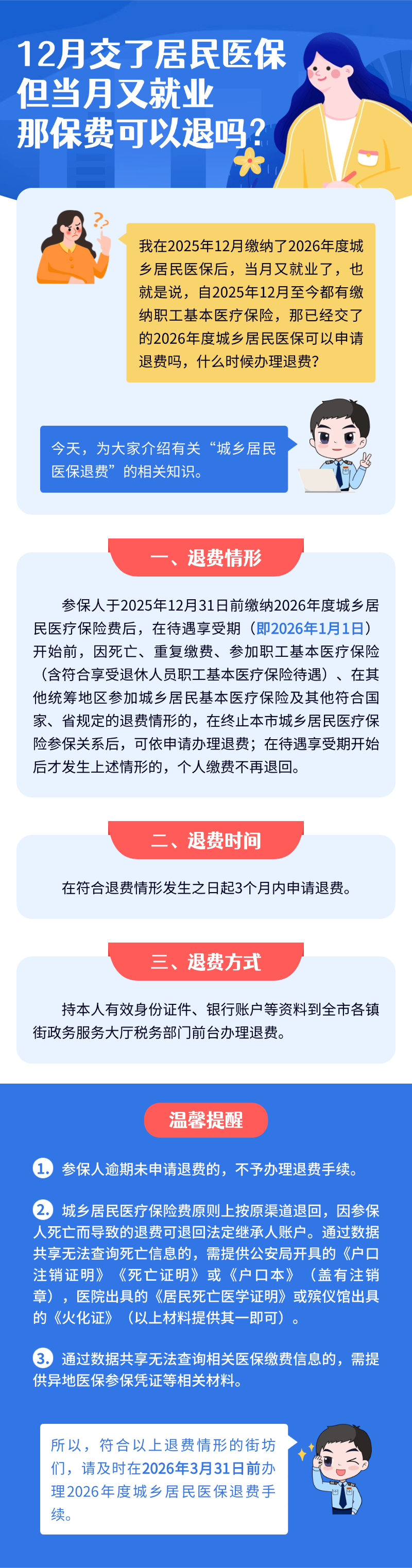 12月交了居民医保但当月又就业,那保费可以退吗?