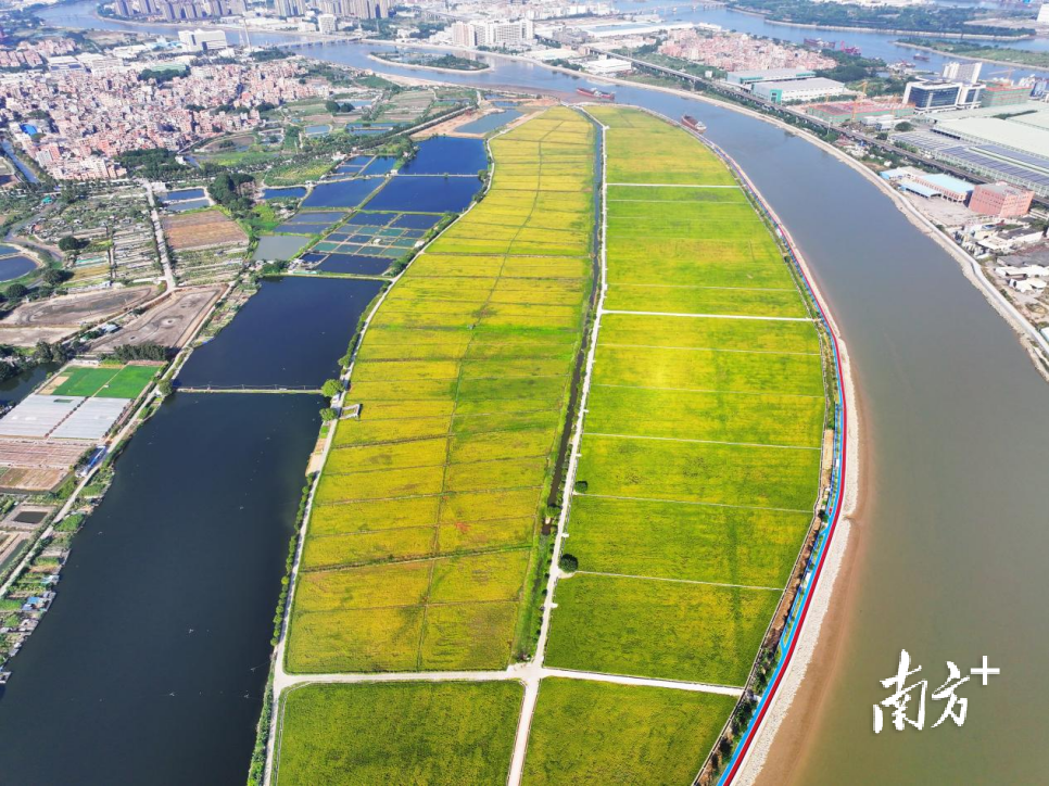 东莞市洪梅镇洪屋涡东江水道岸边,金色水乡稻田公园里,十里碧道环绕着连片的千亩稻田,穗深城际列车从田畔呼啸而过,与远处的现代化厂房相映成趣。很难想象,这片如今让游客驻足、村民自豪的“网红打卡地”,曾是耕地破碎、窝棚遍地的荒芜之地。